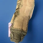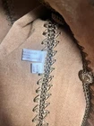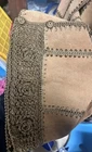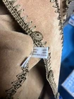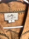 Vintage Scully Leather Suede Crotchet Patchwork Jacket in brown. This jacket features a collared neckline, long sleeves, and a button closure. The outer shell is made of leather and nylon crochet, with a lightweight and breathable design that is perfect for all seasons. The jacket has a regular fit and is unlined, with ventilated fabric for added comfort. The jacket's accents include crocheted lace insets, roses, and buttons. This jacket is perfect for travel, parties, workwear, and casual occasions. It is dry clean only and made in China.