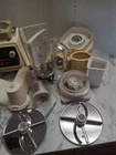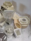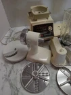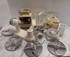 This vintage Sears & Roebuck Kitchen Machine is a fantastic addition to any kitchen. With its beige color and dial control feature, this professional blender can puree, blend and grind with ease. The model number is sears 793.834100 and it was made in the United States. This machine comes with blades, a blender, and a pitcher, as well as adjustable thickness and other great features. It is perfect for anyone who loves to cook and needs a reliable appliance that can handle all their blending needs. The machine is used but in great condition, and it comes with attachments that are sure to make cooking a breeze.