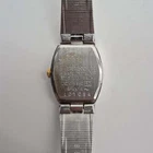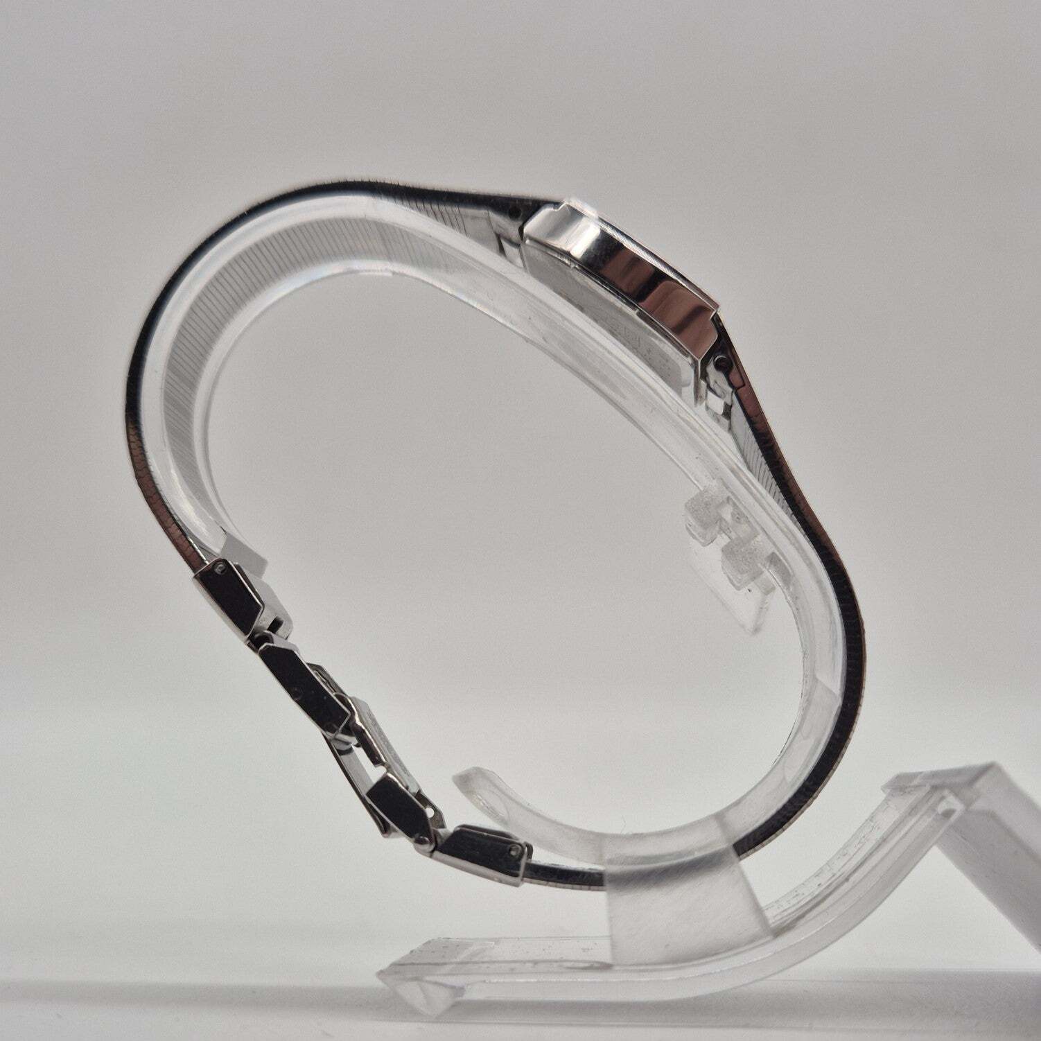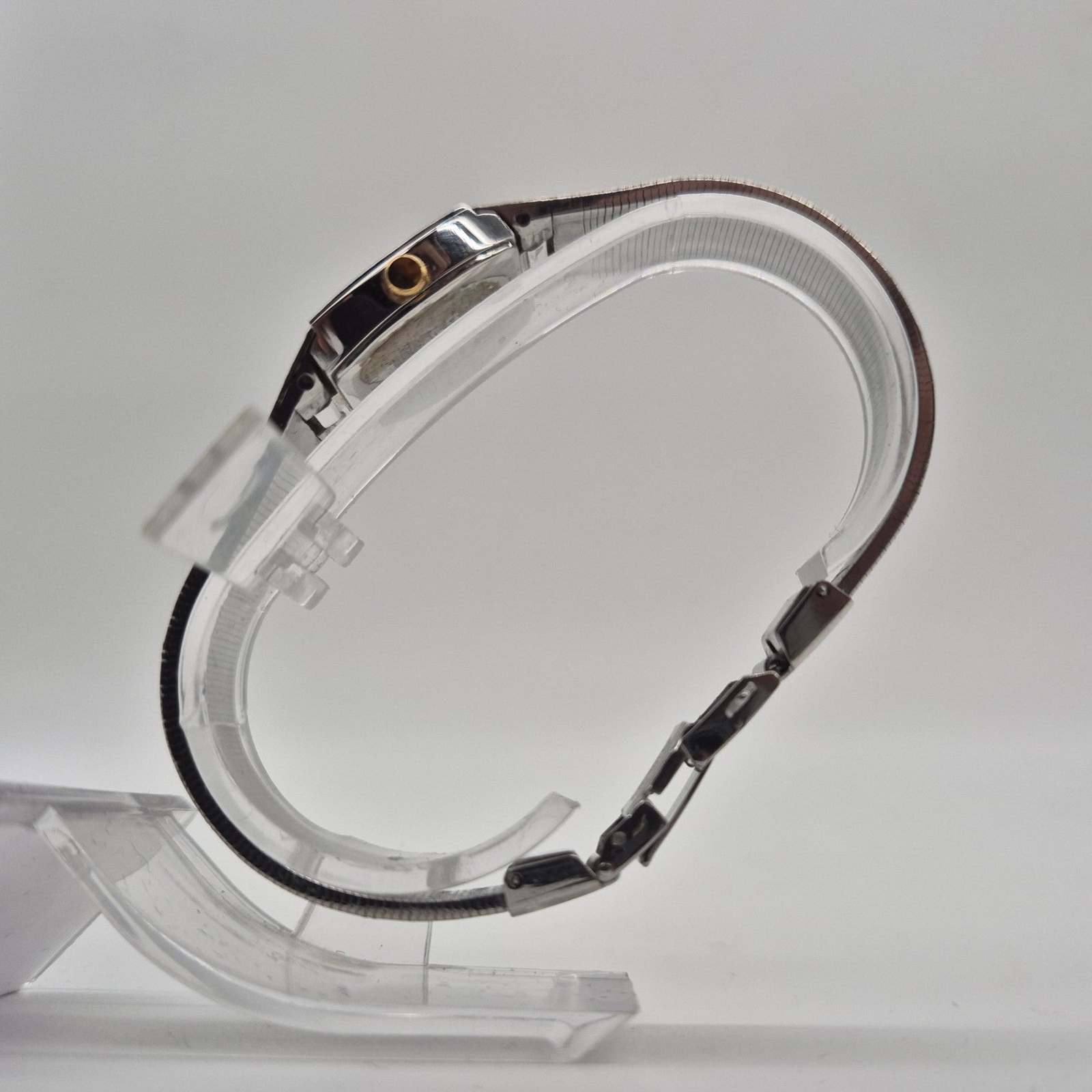 Diese wunderschöne Seiko Damenarmbanduhr besticht durch ihr rechteckiges Gehäuse und ein präzises Quarzwerk. Das silberne Zifferblatt mit goldenen Akzenten verleiht ihr eine klassische und zugleich edle Optik. Der Metallarmband mit feinem, geprägtem Muster verbindet Silber- und Goldtöne harmonisch und unterstreicht das feminine Design. Perfekt für besondere Anlässe oder als elegantes Accessoire im Alltag. Details: Marke: Seiko Artikelnummer: FES0325 Zustand: Gebraucht Material: Edelstahl mit goldfarbenen Akzenten Herkunft: Japan Funktionen: Quarzwerk, Datumsanzeige Gewicht: Ca. 50 g Besondere Merkmale: Klassisches Design mit rechteckigem Gehäuse Hochwertiges, zweifarbiges Metallarmband Präzises Quarzwerk für exakte Zeitmessung