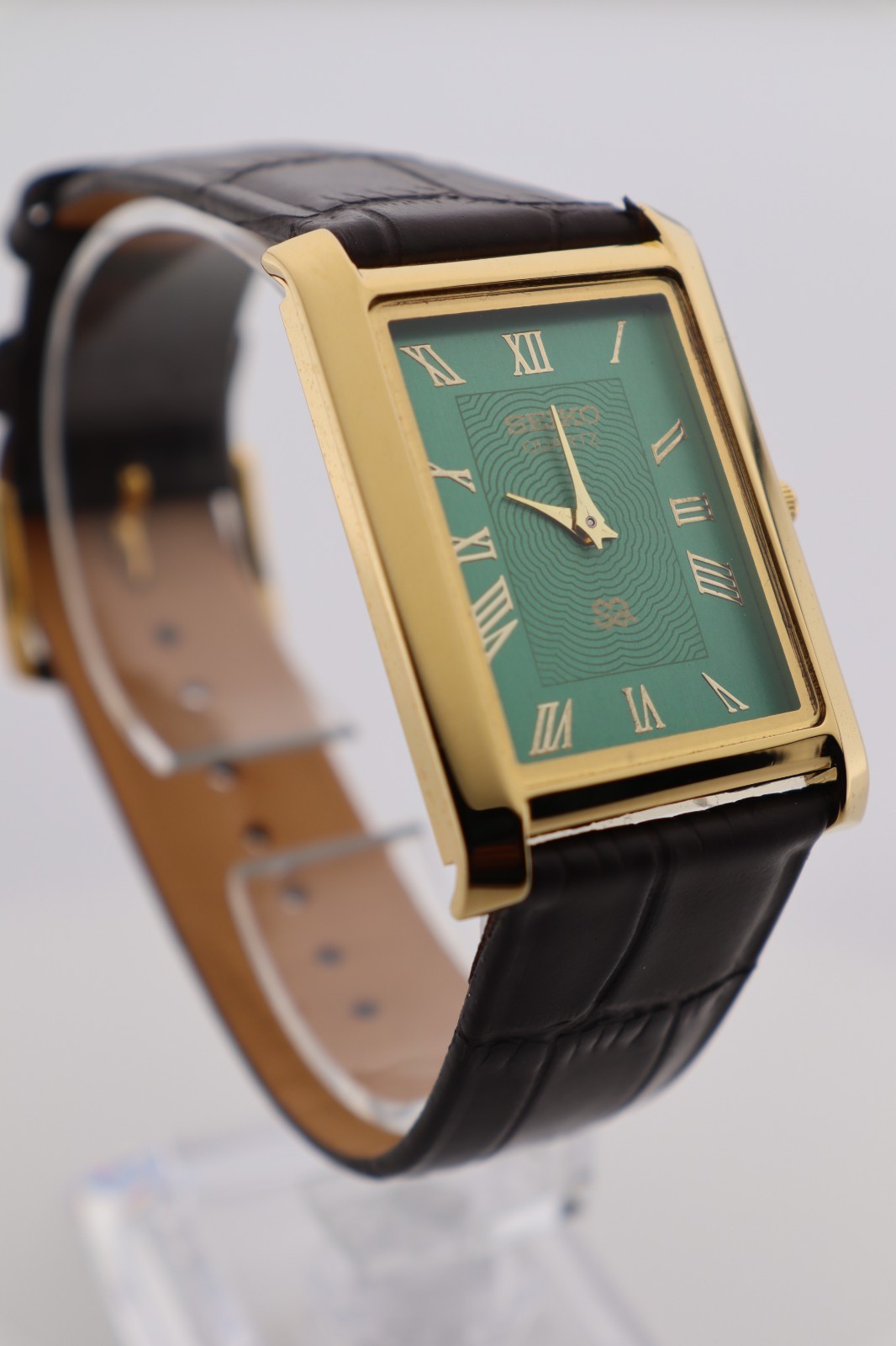 Vintage Seiko Slim Quartz Green Dial Men's Wrist Watch with Green Strap