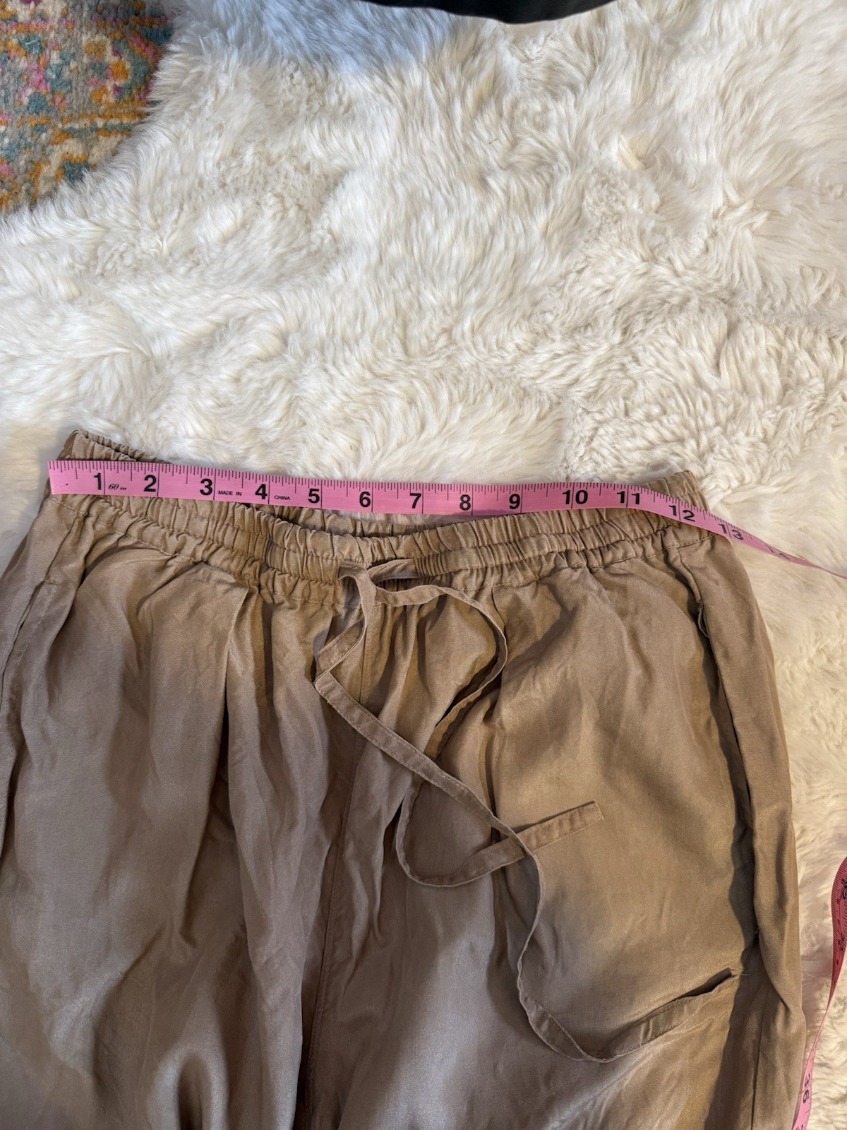 These Vintage Selene Paris Sport 100% Silk Pants in Taupe are a stylish and luxurious addition to any woman's wardrobe. The high-rise waist and flat front give them a sophisticated look, perfect for casual occasions during the summer and spring seasons. Made of silk, these size M pants offer a comfortable fit with a waist size of 26 inches and an inseam of 30 inches. The elegant brown color adds a touch of sophistication, making them versatile enough to pair with any top for a chic outfit.