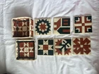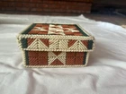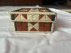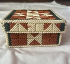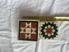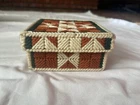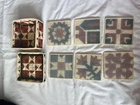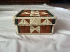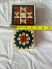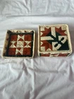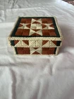 Beautiful handmade coasters with box storage, cream, green and rusty orange, clean with only a few hardly noticeable discolorations/stains and a few small areas on the corners where the plastic shows through. Please see pictures for best description. Thanks for shopping my store! I give a discount on shipping when you combine purchases from my store! Dog friendly, smoke free home.
