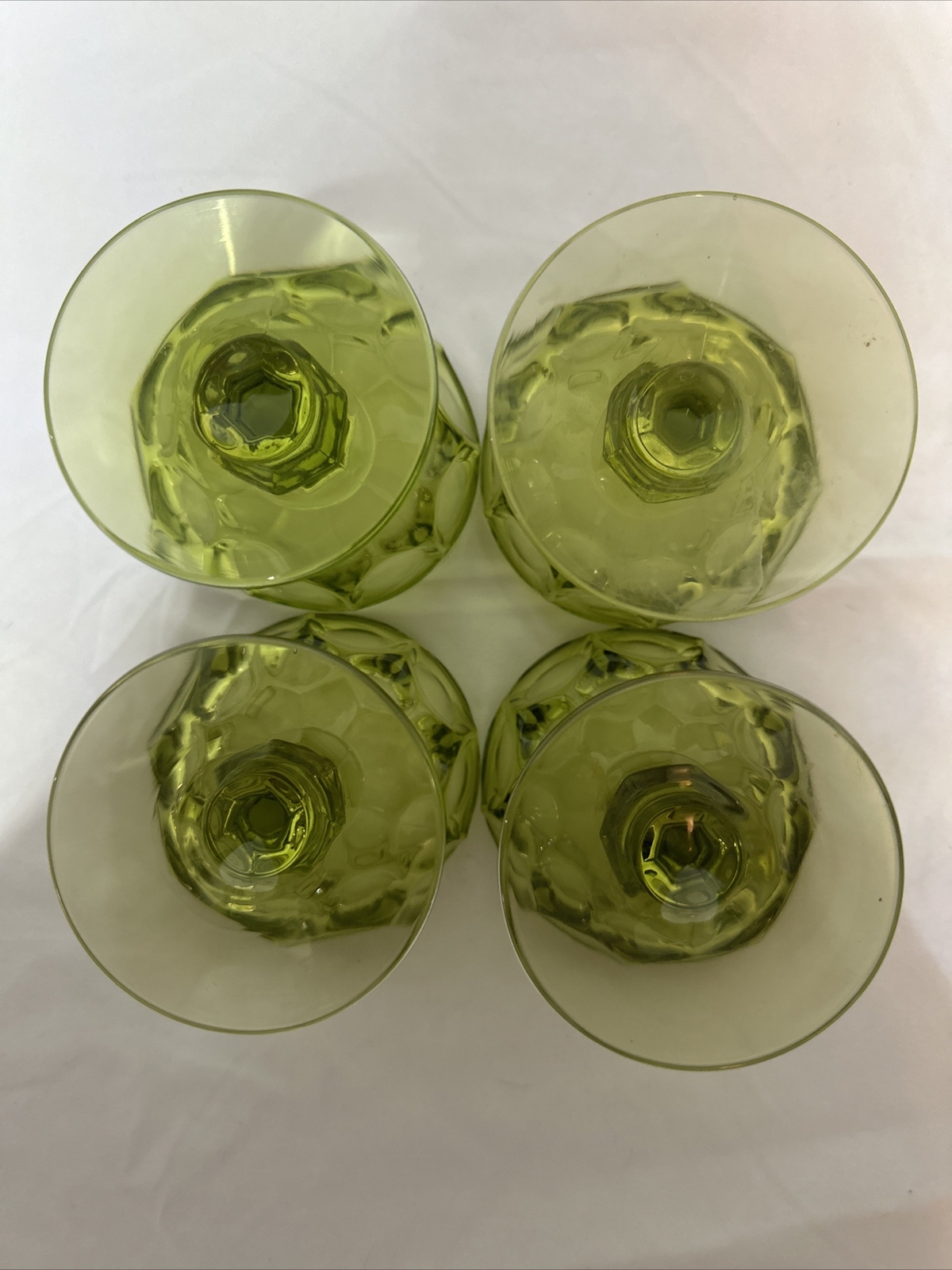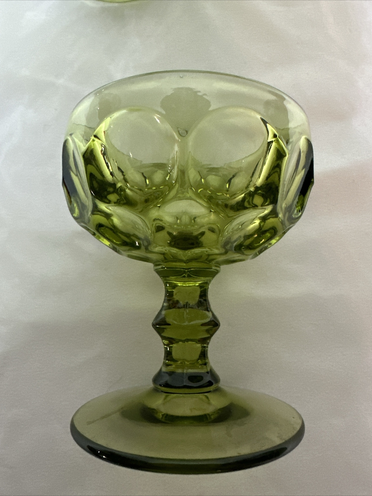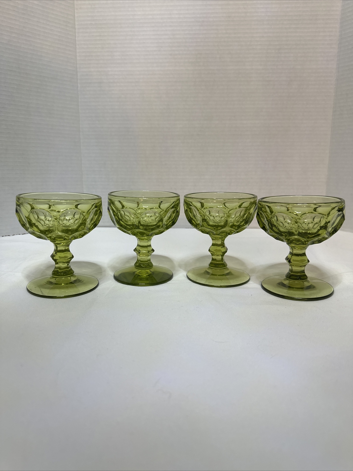 This set of four-piece dessert bowls from Imperial Glass Provincial is perfect for all occasions. The tall sherbet dishes with a pedestal base and thumbprint pattern are made of green molded glass, making them a limited edition. These mid-century modern bowls are machine washable up to 85°F and are original, not a licensed reproduction. The timeless design of these bowls makes them suitable for all ages, and they are perfect for serving ice cream or any other dessert. The production style of these bowls is mid-century, and they were made in the United States. The brand is Imperial, and the era is mid-20th century (1941-1969). These bowls are a must-have for anyone who loves vintage, green, or mid-century glass. Please see photos for condition! There are no cracks or chips! Due to lighting, colors can vary slightly from pictures. ***Please take note*** Flat rate shipping is for the 48 inland states only! if you are purchasing and shipping to Alaska, Hawaii or Puerto Rico, please contact me before purchasing to get a shipping rate. Thank you.