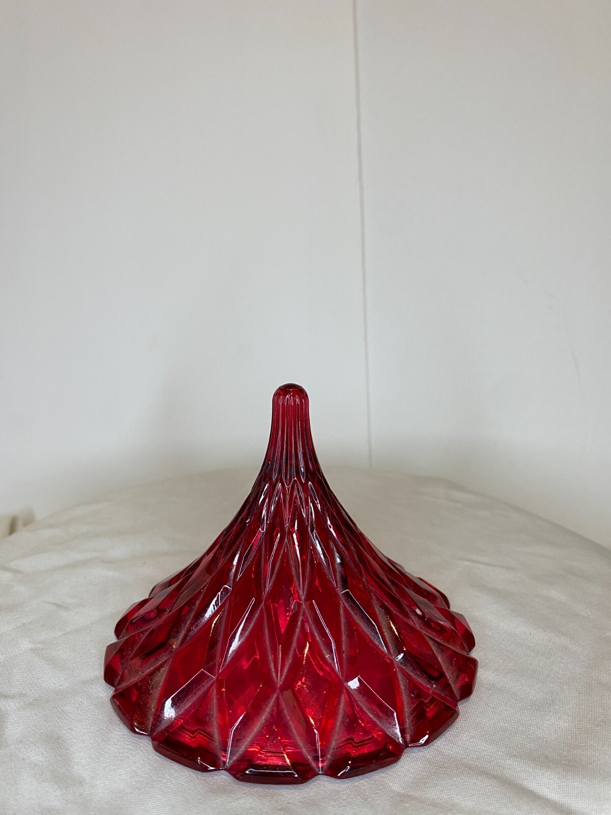 The Shannon Vintage Shannon Crystal Red Hershey's Kiss Candy glass Trinket Bowl W/ Lid is a stunning piece with a diamond pattern and an abstract shape. Made of crystal, this candy dish features a glossy finish and comes in a vibrant red color. The lid is included, making it a decorative and practical addition to any kitchen or dining area. Hand wash only to maintain its beauty, this candy dish is an original production style using fused glass techniques.
