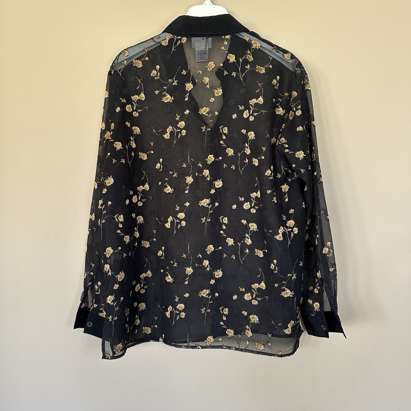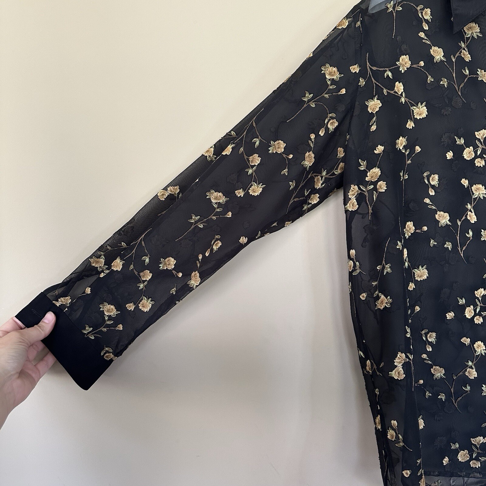 Vintage Sheer Dark Floral Button Shirt Women's size Medium Collared Black / gold flowers Whimsigoth Fairy CONDITION : excellent STYLE TAGS : church going out teacher office grannycore rock gothic MEASUREMENTS length: 28" sleeve: 24" armpit to armpit: 23" Packaged with care I will ship it out within 2 business days Smoke free home Offers welcome.