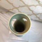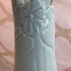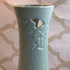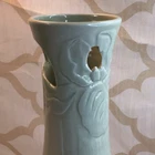 This vintage ceramic vase stands at 7 inches tall and features a green glazed finish with textured carvings. Handmade in 1985, this vase showcases a flower subject and bears a signature. Its medium size makes it suitable for various occasions and its 1980s style adds a touch of retro charm to any space. Perfect for collectors of unique decorative pieces, this original vase from the late 20th century exudes a timeless appeal with its intricate details and craftsmanship. Made in 1985, unable to decipher the signature. Has a beautiful green crackle finish with cut outs. No chips or cracks. Please look at the pictures closely, as this is the item that you will receive.