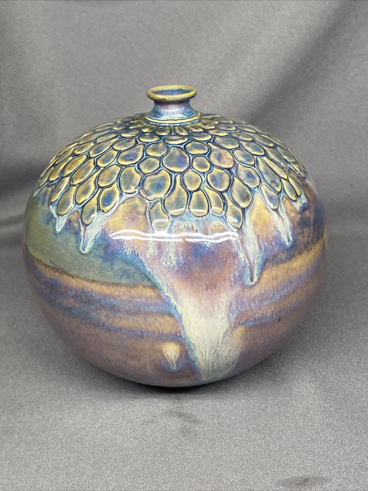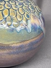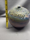 Discover the unique artistry of the handcrafted James Loso pottery vase, a true vintage gem that brings a touch of iridescence to any space. With its multicolored palette and textured finish, this vase stands out as a testament to Loso's distinctive art pottery style, making it a prized addition to any collection or decor. Each detail of this piece reflects the skilled production techniques employed by Loso, renowned for his exceptional pottery work. The vase's intricate design and vibrant hues are sure to captivate and add an air of sophistication to your home or office. Enjoy the timeless elegance and artisanal charm of this signed James Loso creation. It measures approximately 5 1/2" tall & 5 1/2" in diameter. No chips or cracks. Excellent condition. See photos.