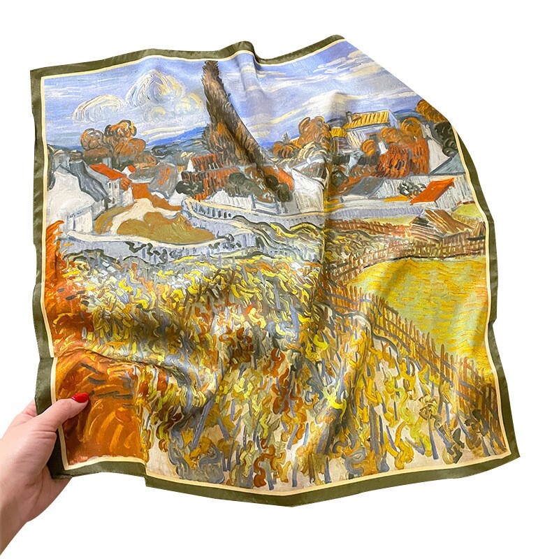 100% Silk Scarf Beige Green Floral Bandana Turban for Women 53cm