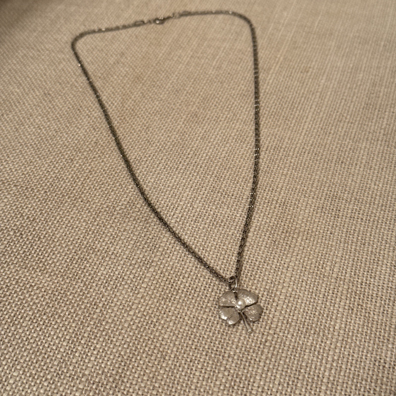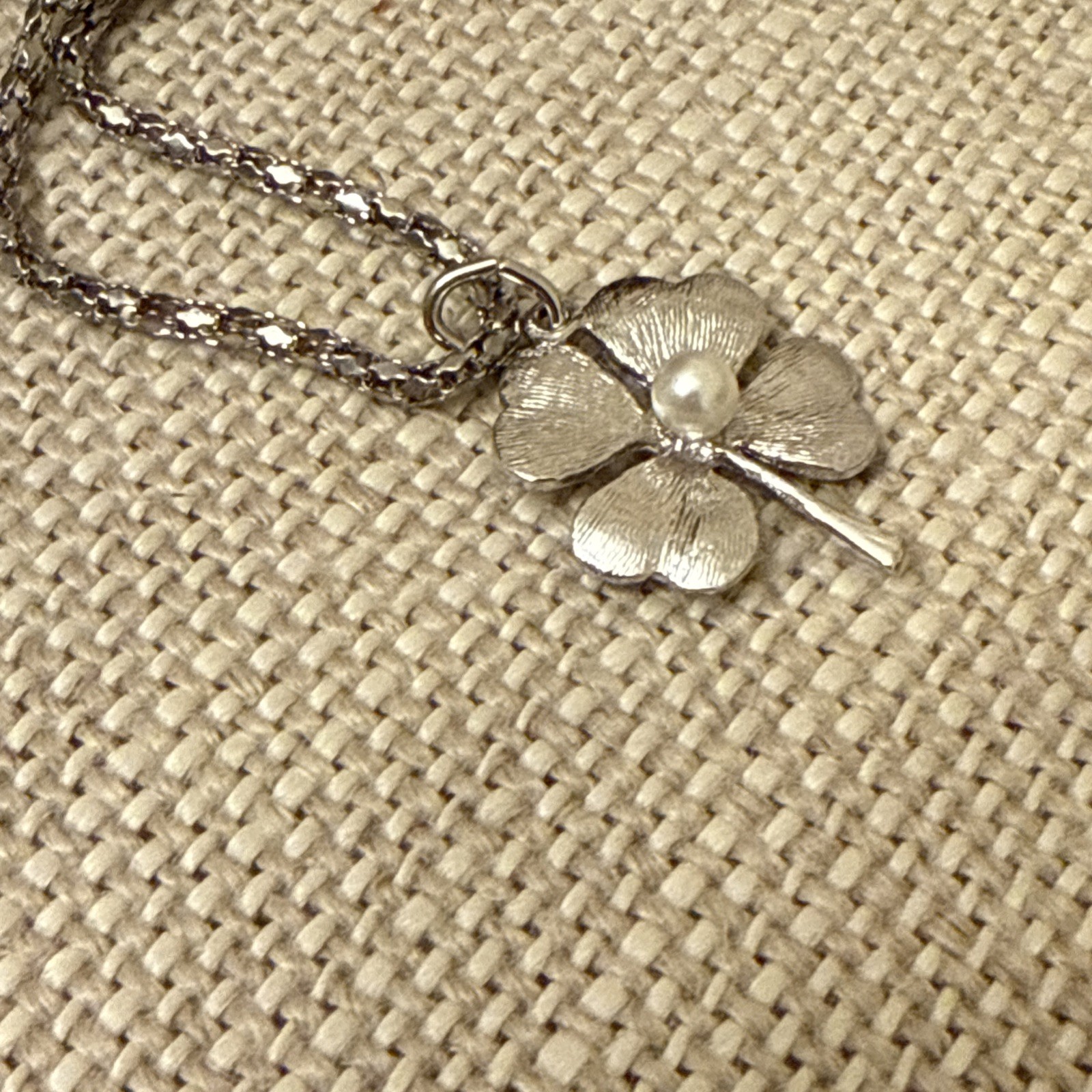 Vintage Silver Four Leaf Clover Textured Faux Pearl Chain Necklace. Condition is Pre-owned. Shipped with USPS Ground Advantage.