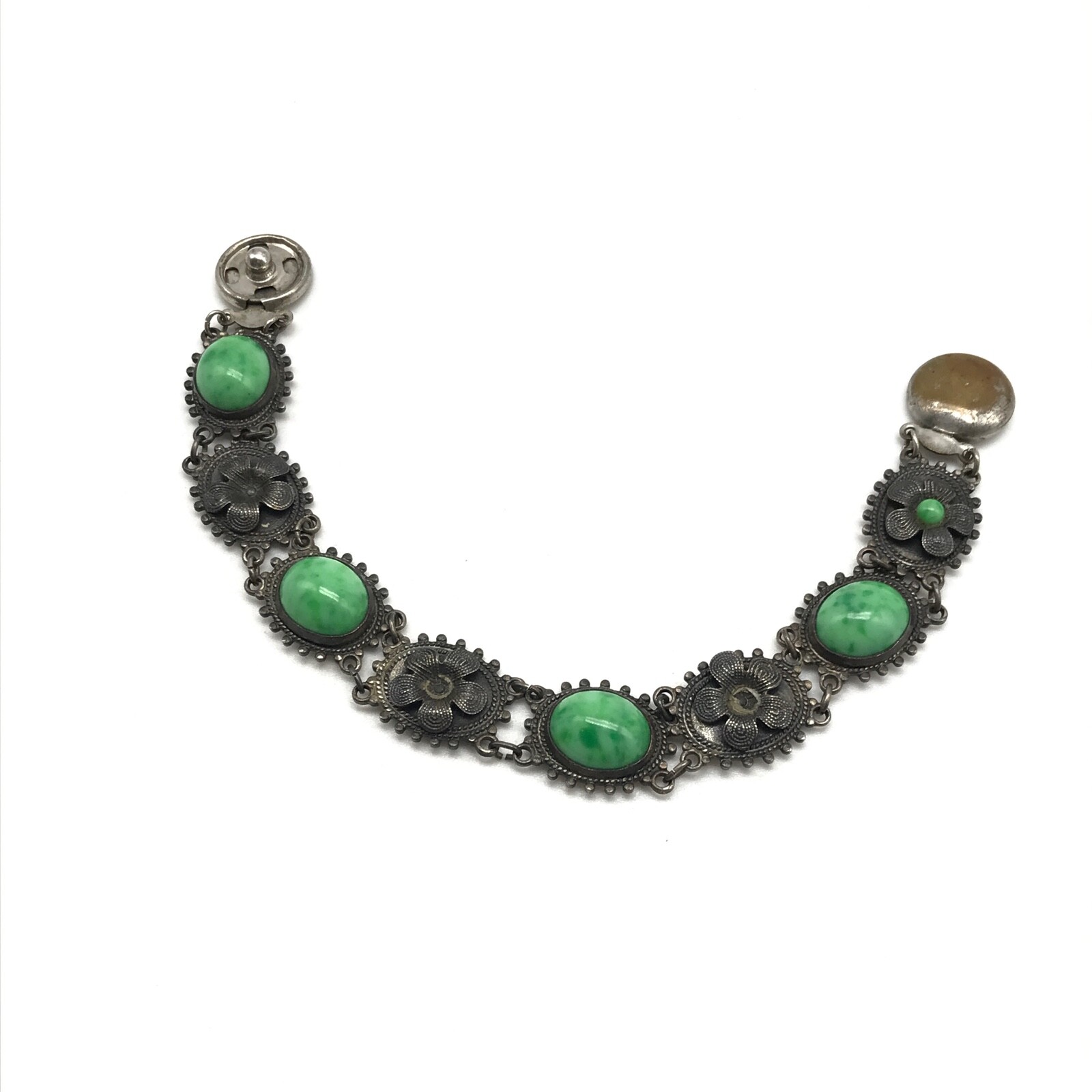 Vintage Antique? Silver Tone Green Stone Flower Link Bracelet 7" Item details: Length: 7" Makes a perfect gift to yourself or a loved one. - Please note, most of my store's items are vintage or pre-owned. Most items are in very good/good fine estate condition, but please also view all pictures. Well cared for. Please feel free to ask any other questions you may have. - Jewelry is packaged safe and securely with a gift box or pouch. - Thank you so much for shopping with me! P lease check out my store, I list new jewelry everyday!