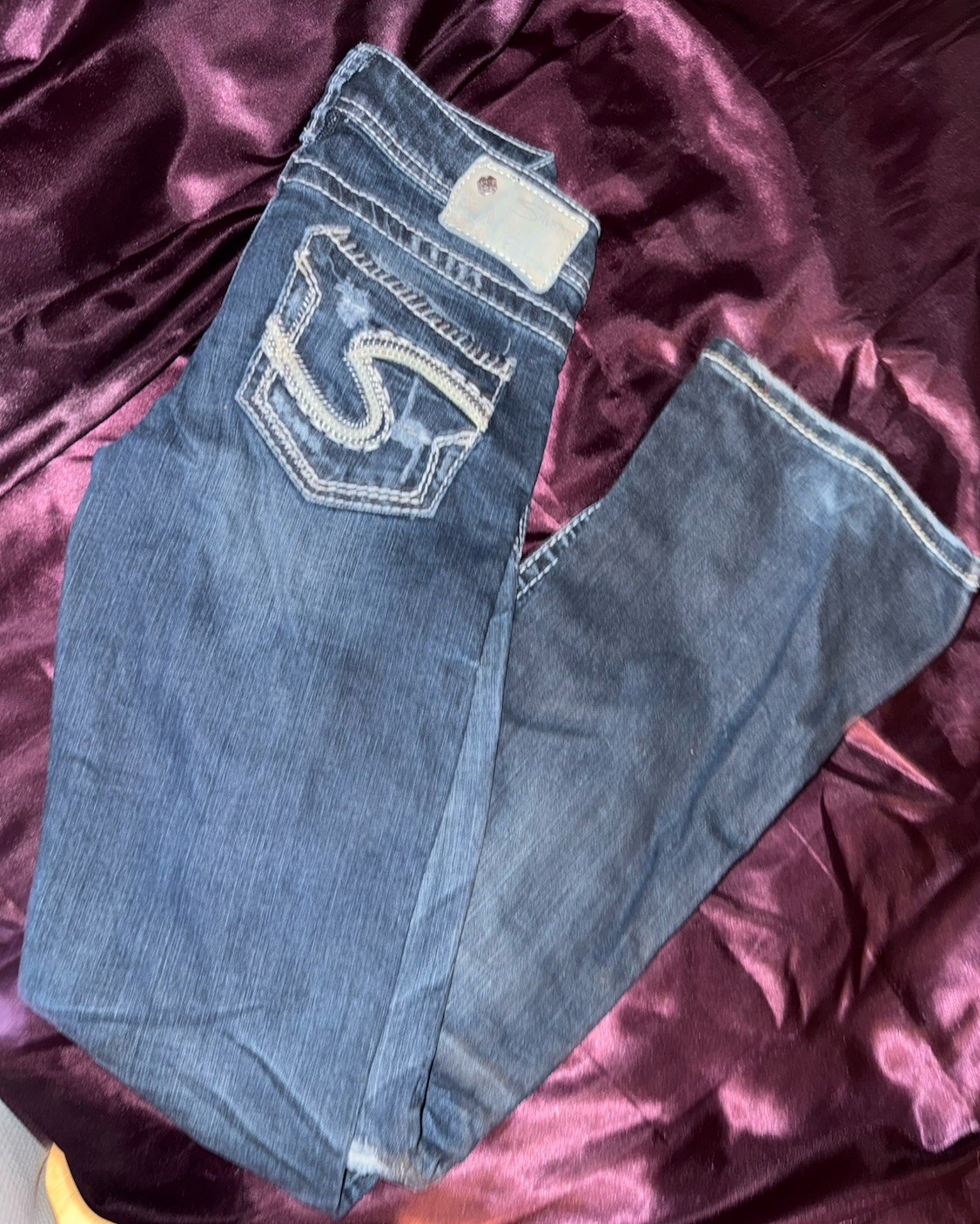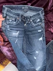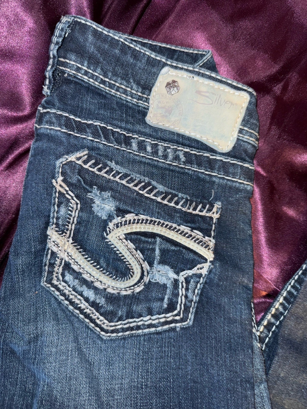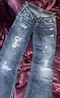 These vintage Silver Jeans are a size 24 with a distressed dark blue wash, perfect for adding a touch of edgy style to your wardrobe. The bootcut fit and low rise make them flattering and comfortable, while the studded and beaded accents add a touch of attitude. Made from cotton denim with a stretch for added comfort, these jeans are ideal for the summer, fall, and spring seasons. Easy to care for, they are machine washable and feature a classic 5-pocket design, making them a versatile and stylish choice for any casual outfit.