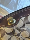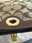 The Vintage Small Bag by COACH is a classic women's handbag crafted from leather in a solid rectangular shape with a zip closure. This stylish shoulder bag features a vintage design with a brown exterior and leather strap, perfect for adding a touch of elegance to any outfit. With inner pockets for organization and a charming bag accessory, this Coach handbag is a timeless piece that is sure to become a staple in any woman's wardrobe.