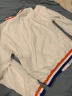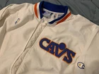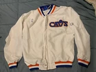 This is in good vintage condition from a non-smoking home. Note there is a light colored mark on one of the sleeves so please view pictures carefully before bidding. Show off your love for the Cleveland Cavaliers with this vintage game jacket. Made of satiny polyester material, this original piece from the 1980s is perfect for any fan. The jacket features the iconic Champion brand, and is available in a men's size small (but runs a little large - see pics for measurements). The white color and classic design make it a versatile addition to any wardrobe. Whether you're cheering on the team at a game or adding to your vintage collection, this jacket is a must-have for any true Cavaliers supporter.