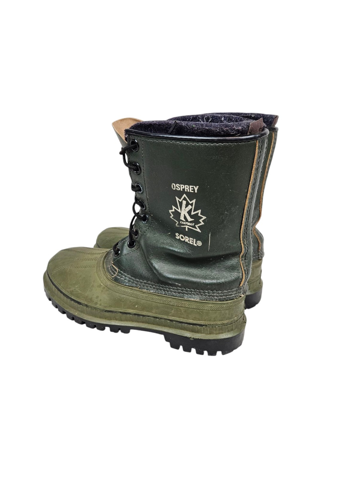 Vintage Sorel Osprey Waterproof Pac Lined Boots Snow Winter Kaufman Size 7 Men In great condition Vintage Sorel Osprey Waterproof Pac Lined Boots Snow Winter Kaufman Size 7 Men's. Features vintager Sorel Osprey waterproof winter pac boots by Kaufman, green leather uppers, rugged rubber soles, waterproof base, wool lined, lace up, mid calf snow boot, outdoor, workwear, utility. Made in Canada Measurements heel height 1" shaft height 9.5" Fabric wool, acetate This is a pre-owned item that may show signs of wear. In great condition, light wear to leather upper and creasing. 14 Day returns accepted under the following conditions: Item must be in the same condition as stated If item shows additional wear buyer will receive a partial refund Buyer pays all shipping costs Refund amount will be for the item price only Please contact me prior to starting a return