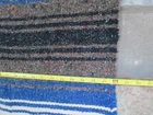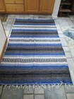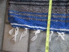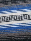 Vintage serape rug / runner / blanket in colors of bright blue, white, gray, black. Great for the floor, bed, or the wall or to keep warm at sporting events! Measures approx. 81 x 48". Woven. Heavy, yarn like material. From smoke free home. Without stains, holes, or wear. Exact age unknown.