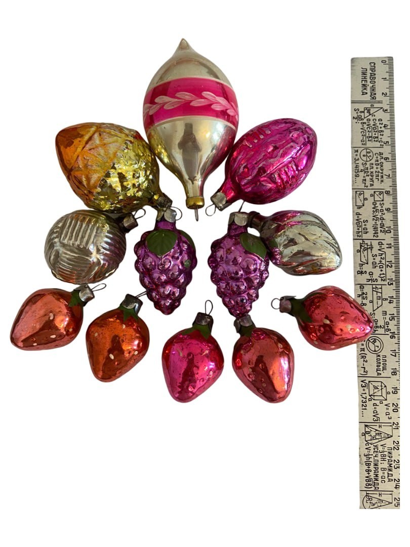 Original vintage Soviet Christmas tree glass ornaments, made in USSR in the 1970s. Lot of 12 different pieces, in very good vintage condition. Beautiful classic shapes: fruits, berries, grapes, icicles, traditional retro patterns. Sizes: see photo with ruler for reference. You will receive exactly the ornaments shown in the pictures — please check photos carefully for details and condition. Material: Glass. Made in USSR. Perfect for collectors, retro Christmas decor lovers, or vintage enthusiasts! The package will be carefully packed for safe international shipping. Feel free to ask for more photos or information!