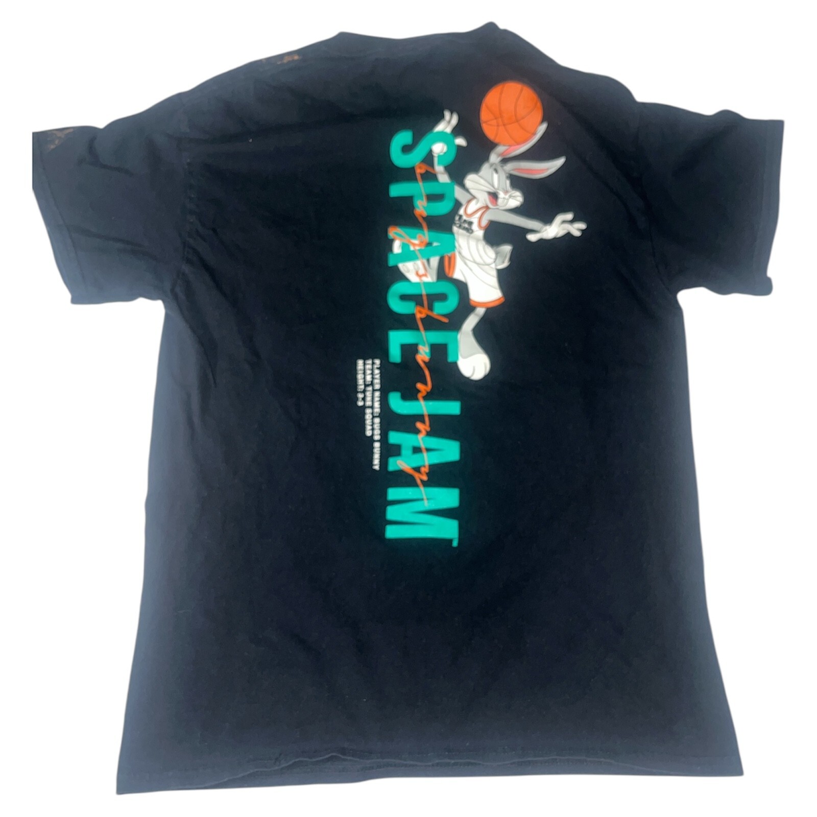 Step into the spotlight with a touch of nostalgia in this Vintage Space Jam Bugs T-Shirt. The classic black tee, sized medium for a comfortable fit, features the iconic cartoon theme that has captivated fans for years. Its short sleeves make it a versatile choice for any casual occasion, while the regular fit ensures it pairs seamlessly with your favorite jeans or shorts.Crafted with care, this T-shirt proudly bears the Space Jam brand, promising quality and style. Designed for the men's department, it's a subtle nod to the Y2K era that made cartoon-themed apparel a staple of the time. Whether you're out with friends or lounging at home, this shirt is a perfect way to showcase your laid-back vibe with a trendy edge. USED *Please note stain on left shoulder hem and sleeve as shown in pictures.