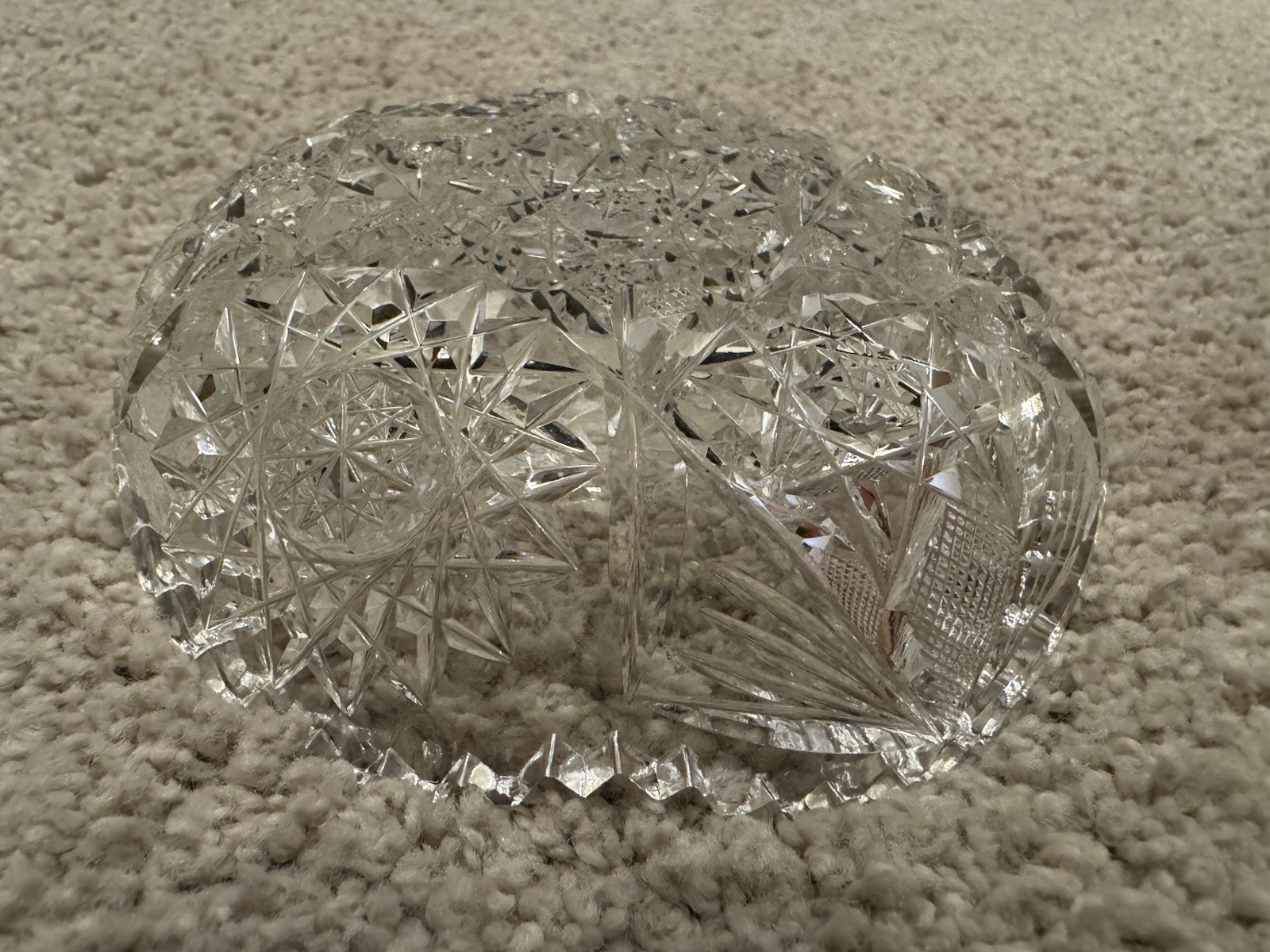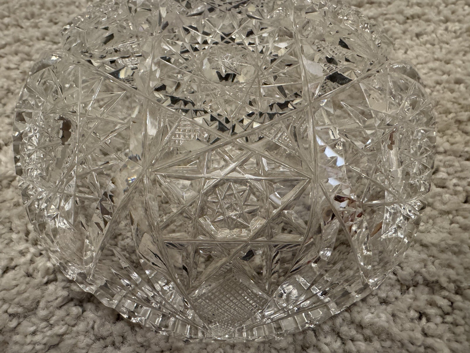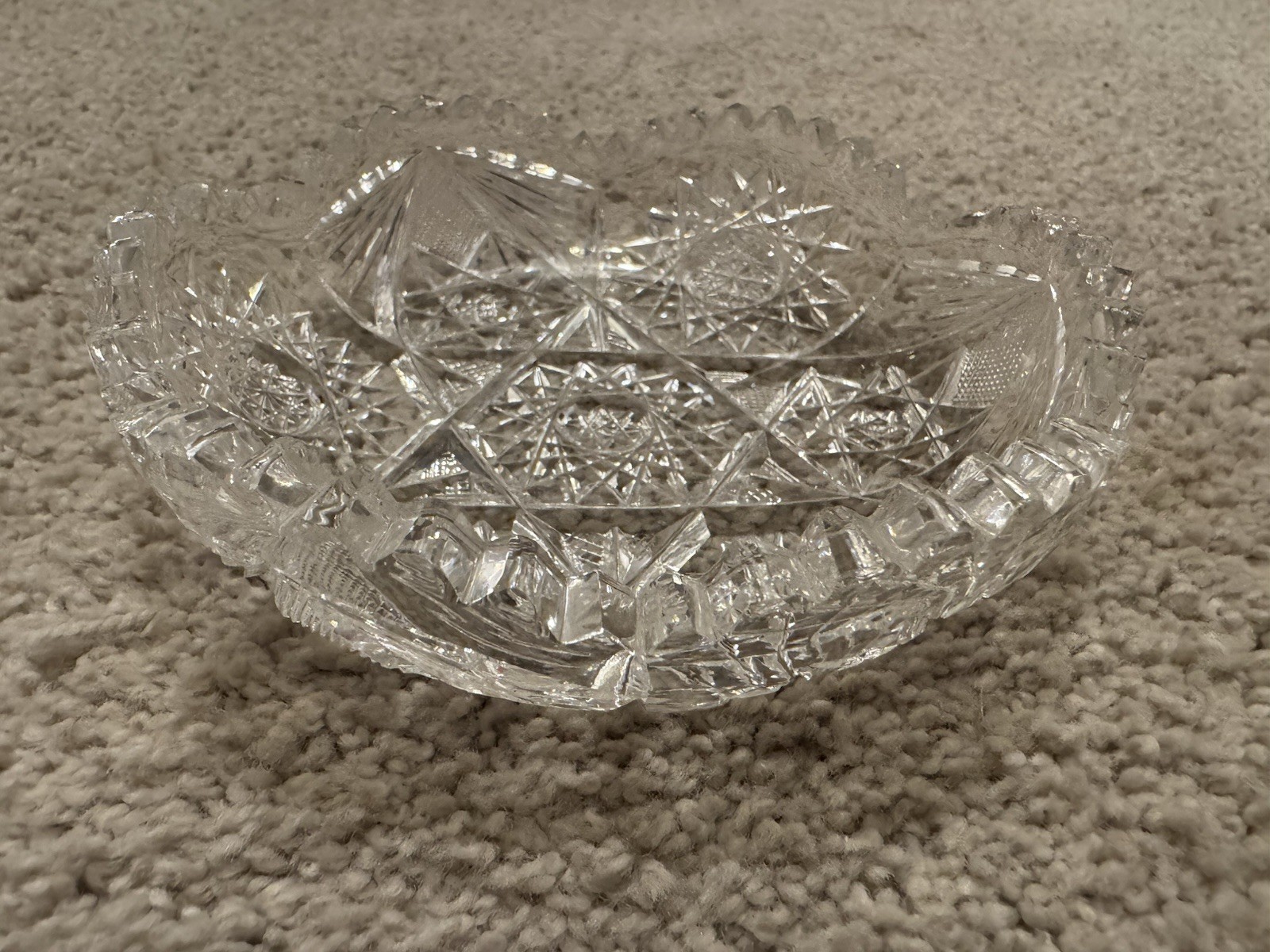 This product is a vintage star pattern cut clear glass candy bowl, measuring 5 inches in diameter. The bowl features a classic vintage design with a star pattern, made of high-quality clear glass in a cut glass production style. The unmarked brand adds to its unique and nostalgic appeal. Perfect for displaying candies or decorating a table setting, this bowl brings a touch of elegance and charm to any space.