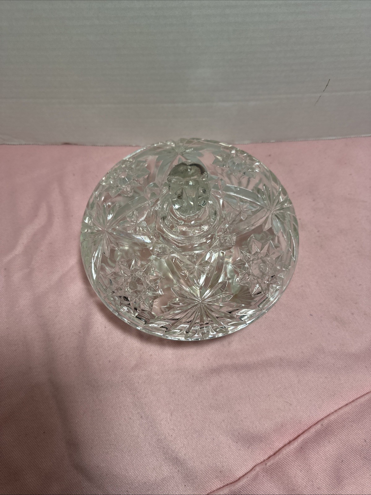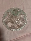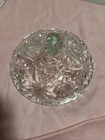 This vintage lead cut crystal candy dish with a lid is a stunning piece made of clear glass with a star-shaped design and pinwheel accents. Standing at 6.5” tall, this original candy dish from the brand Candy is a beautiful addition to any home decor, especially for those who appreciate vintage pieces. The elegant design and crystal material make it a unique and eye-catching item for storing candies or potpourri. With its intricate details and vintage charm, this candy dish is sure to be a conversation starter in any room. Lot M