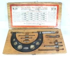 Here is an Older Starrett No. 224 Micrometer Caliper Set AA. It is missing the biggest anvil. It is being sold for parts or repair because there is some corrosion to the spindle, including to the face of it. the wood box is dirty.