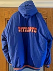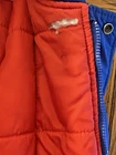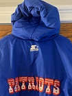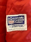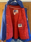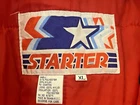 This Vintage Blue Starter Patriots Puffer Jacket Hood in size XL is a rare find from the 70s-80s era. The jacket features a patriotic theme with its red color and features a hood for added warmth. Made with polyester insulation and machine washable, this regular fit hoodie is a classic addition to any man's wardrobe. The Starter brand adds a touch of nostalgia to this timeless piece, perfect for cooler weather.