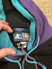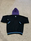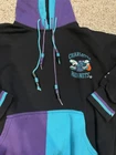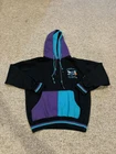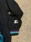 This is a vintage Starter Charlotte Hornets hoodie in youth size Large, featuring a black color with a double-faced design. The hoodie is officially licensed by the National Basketball Association (NBA) and is suitable for boys. It is a piece of fan apparel for the Charlotte Hornets team from the 1990s, made in Korea. Perfect for young basketball fans looking to show their support for the Hornets in retro style. In good condition. Please see measurements for any questions