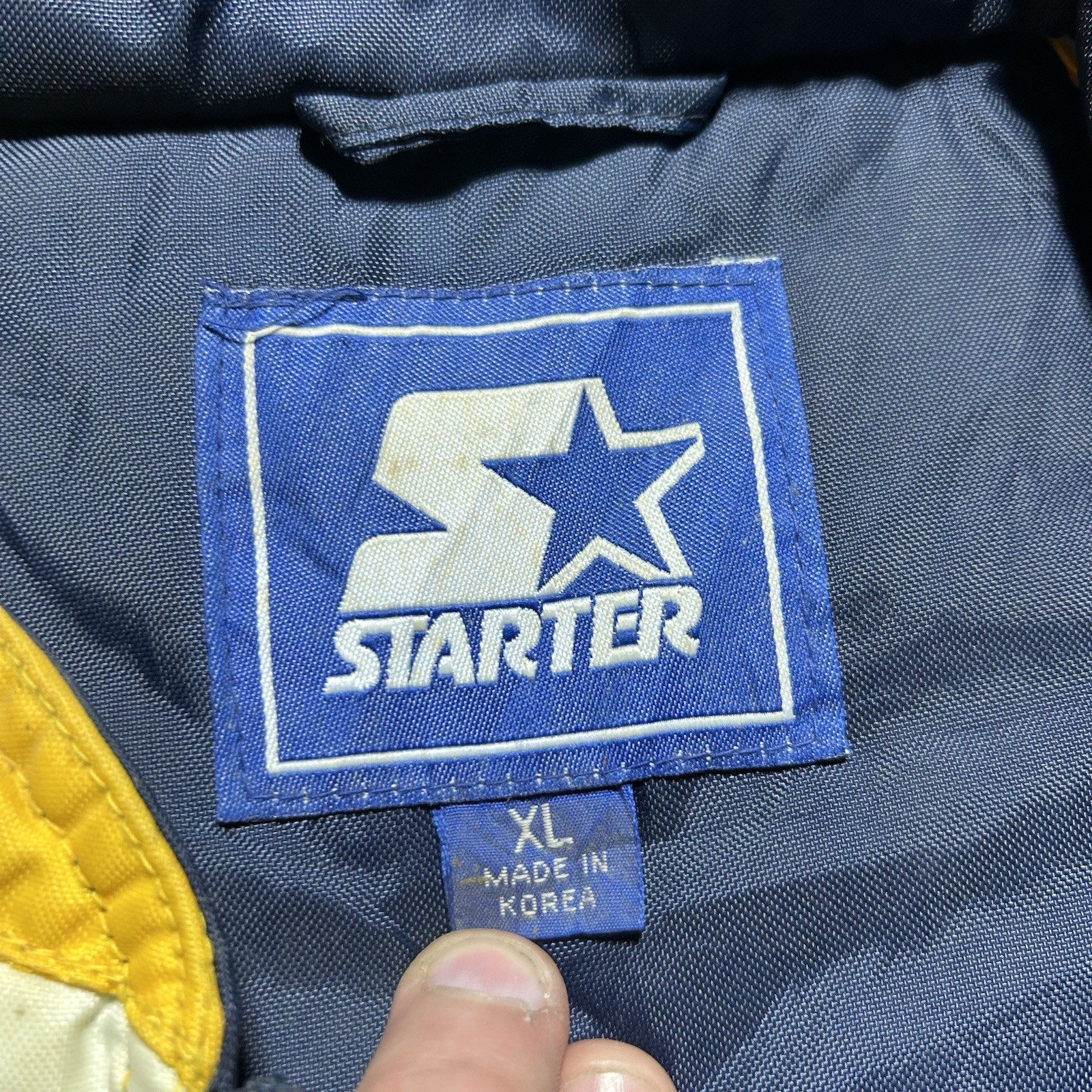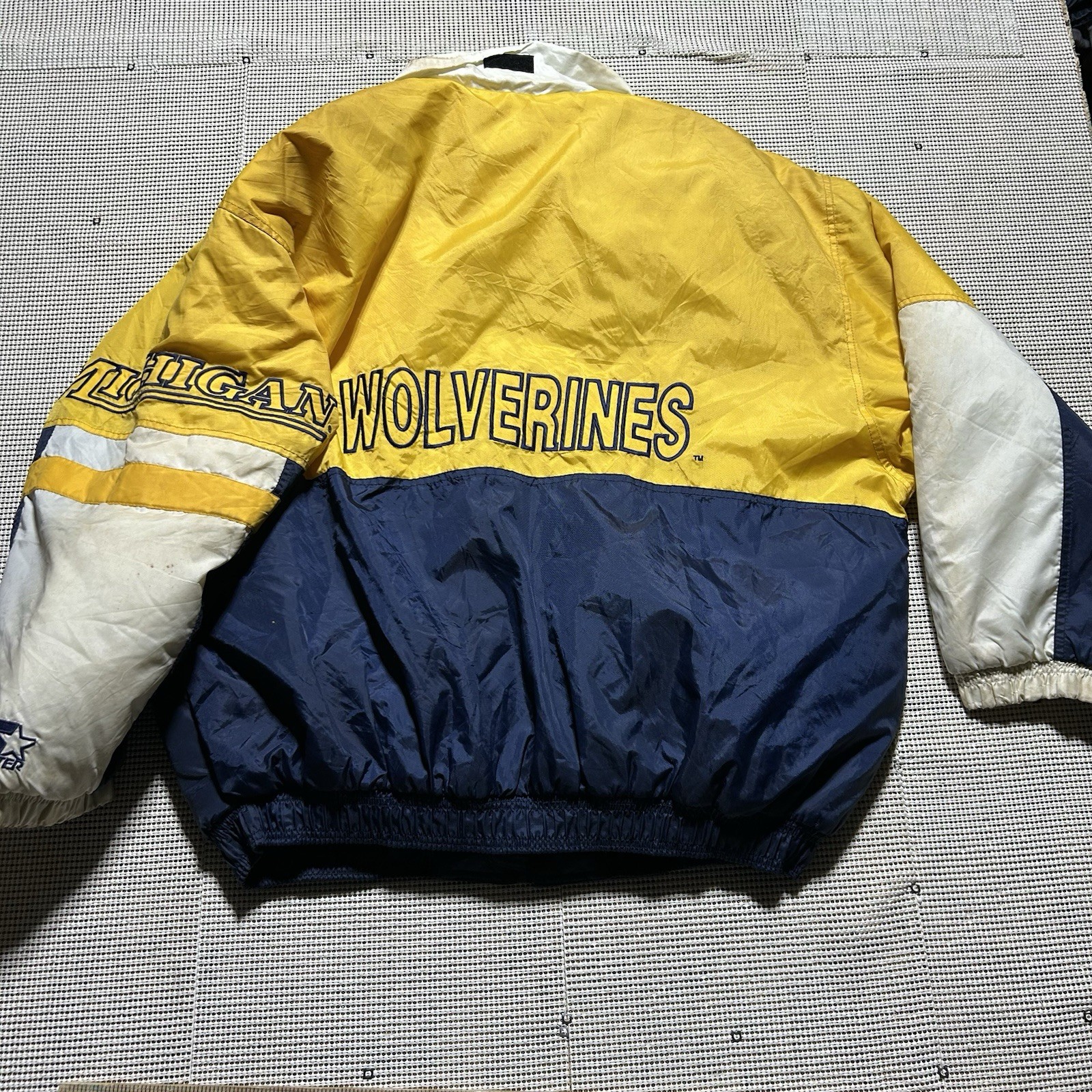The product is a vintage Starter Michigan Wolverines pullover jacket in size XL. This NCAA team apparel is perfect for football fans, specifically those who support the Michigan Wolverines. The jacket is in the team's signature blue color and is designed for men who want to show their team spirit during the regular season games. Made by Starter, this item is a must-have for any fan looking to stay warm and stylish while cheering on their favorite college football team.