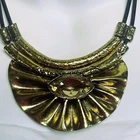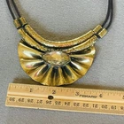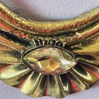 Gorgeous vintage 80s statement choker necklace. Stunning hammered and molded gold tone metal creates a multi piece crescent shaped bib. It features a large faceted rhinestone. Pieces hang on a dark brown cord. The length was hard to measure due to the design of pendant but it is approximately 16.5 inches long and has a 3 inch extension chain for adjustment. See photos taken with ruler for more detail on size and added description. Focal point of necklace is in very good condition. The cord shows a little age and wear. Please see photos. Zoom for more detail and assessment of condition. Feel free to contact me with questions. I will create custom bundles & give discounts for purchases of more than one item/listing + combine shipping for extra savings. Quotes provided on request. All sales are final. Returns are not accepted; however your satisfaction is important to me. Please reach out if there is a problem with your purchase. Thanks! PassionatelyCollected I passionately collect things.....