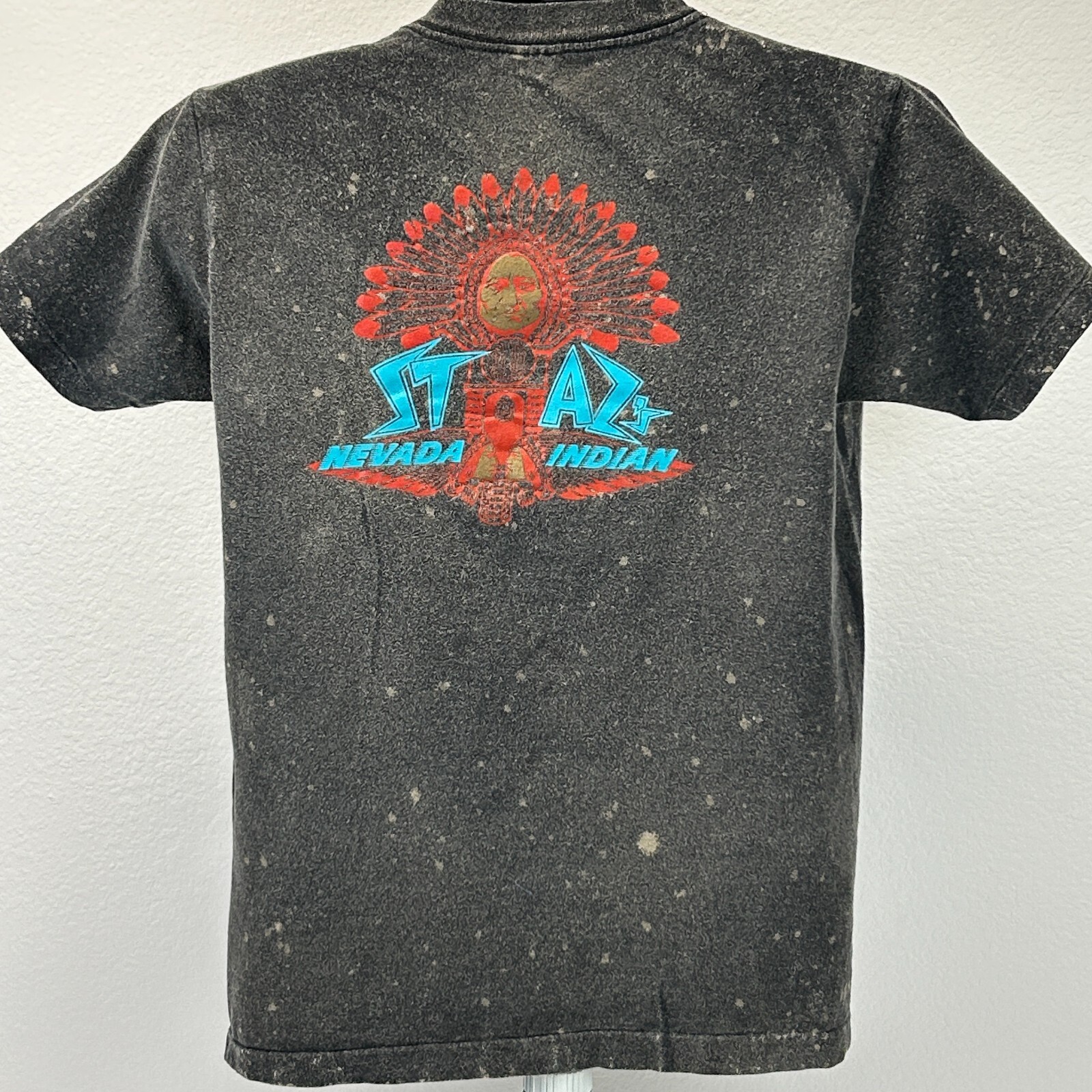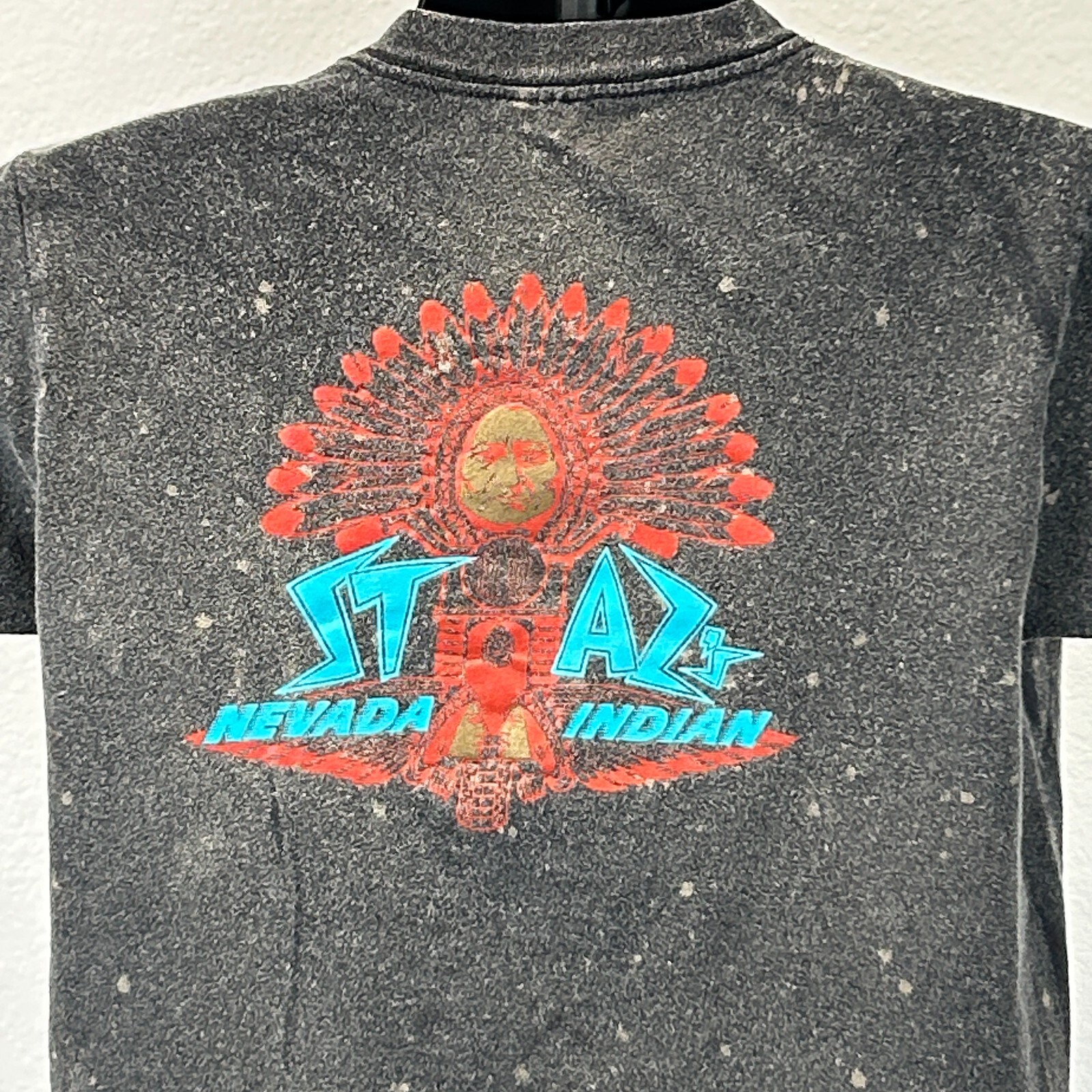 Vintage 1990s Staz's Nevada Indian Motorcycles Dealer T Shirt Biker Black Bleach Spotted Tie Dye Caribbean Dream Single Stitch Graphic Tee Condition: Has fading. No other flaws noticed. Tag is a Large but I feel it measures more similar to a modern Medium. Check measurements to ensure fit. See photos. Size and Measurements: Mens/Unisex Medium Width 19" - Underarm to underarm Length 26" - Measure from top of shoulder, at the edge of collar, to the bottom of the shirt