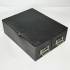 Vintage Steel 2 Drawer Library Card File Box Stackable Metal Parts Storage Black Measures approximately 16" long x 12.25" wide x 5.5" tall; each drawer is 16" long x 5" wide x 3" tall Rubber feet on the bottom protect surfaces Good condition with some denting and discoloration due to normal use; may be a little dusty from storage Two are available
