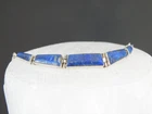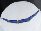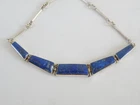 Find the key to accessory success in this statement making vintage sterling silver necklace. Beautiful natural lapis stones light up the center. This necklace appears all handmade. It is stunning. It is in good vintage condition with normal wear. No missing or damaged stones. May need to be polished. WEIGHT: 9.5 grams MEASURES APPROX: 18" long end to end x .35" widest in the center The center is approx. 3" long Center stone is approx. 8mm x 19mm Signed 925 for sterling silver is marked on the hook clasp and the back of the necklace