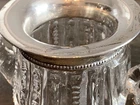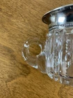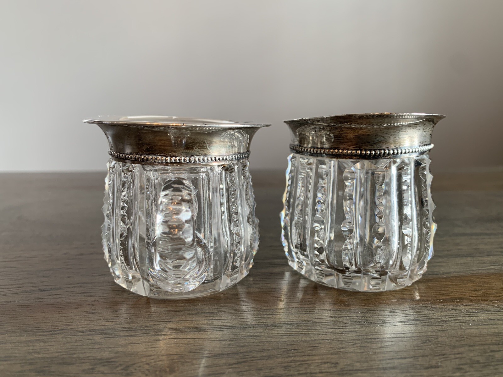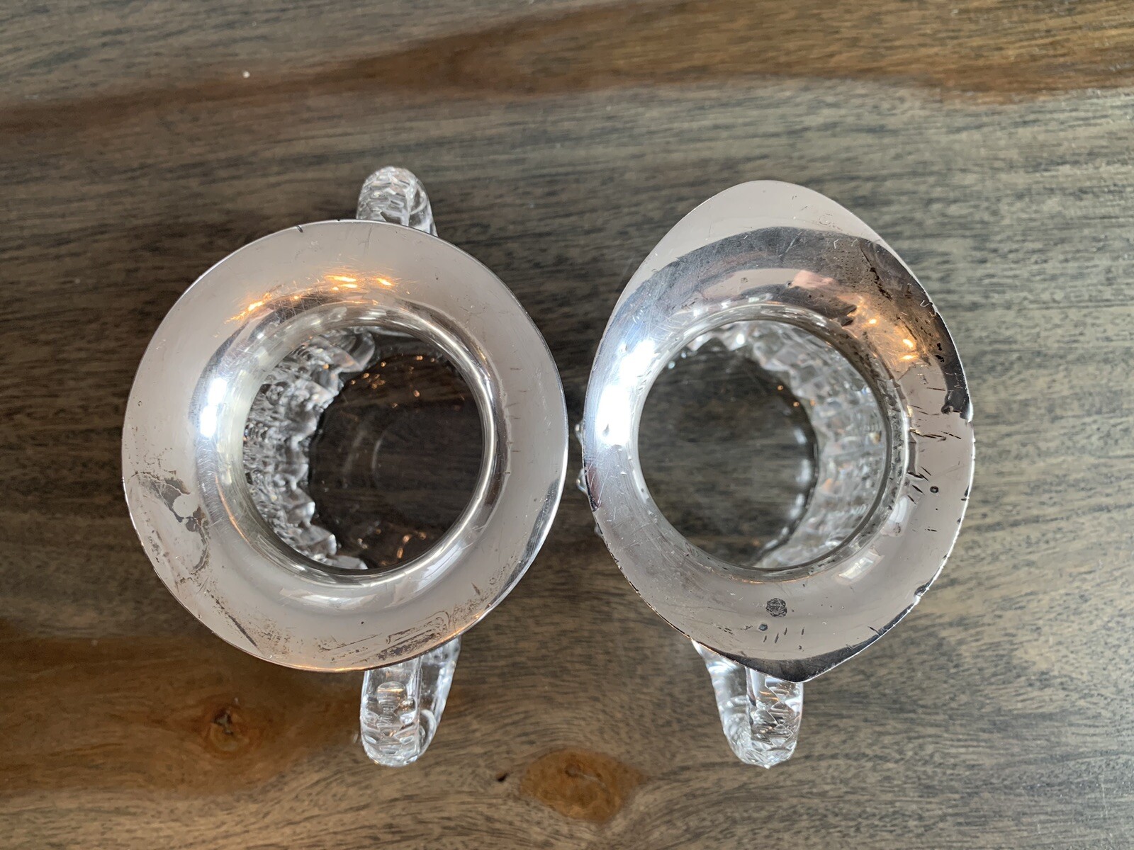 Sterling Silver and Glass Creamer and Sugar Bowl Set Vintage Flat Bottom In good condition, shows normal wear consistent with age and use like scratches and dents in the silver. One handle of the sugar bowl has a crack. Priced accordingly. Please refer to the pictures as they’re part of the description. Measurements: Sugar bowl: Length: 11.0 cm - height: 6.5 cm -width: 7.3cm - weight: 148g Creamer: H: 9.5 cm -h: 6.6 cm - width: 6.4 cm Weight: 134 g