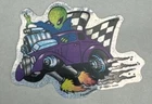 This is a sticker that would have been dispensed in a vending machine or gum ball machine. It features an alien in a purple race car. Has a sparkle finish. Would be great for a skateboard, laptop, water bottle, guitar case and more!