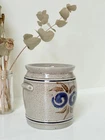 This vintage stoneware confit pot brings rustic French character and timeless style to any kitchen or interior setting. Traditionally used for preserving meats in rural households, a confit pot like this one now makes a versatile and decorative piece for modern homes. Measuring 12.5 cm in height and 12 cm across, the pot has a pleasingly solid feel and a gently tapered shape. It is decorated with hand applied blue and brown folk art motifs on a soft grey ground, a classic colour combination that adds warmth and charm. Two small side handles enhance the design and make it easy to move or display. The pot can be styled in many ways. Use it to hold cooking utensils beside the hob, as a container for dried flowers or herbs, or simply as a stand-alone decorative accent on a shelf or dresser. Its neutral yet distinctive palette blends well with natural woods, marble or contemporary kitchen finishes, making it an easy fit for both rustic and modern interiors. Condition is excellent. The glaze retains its soft sheen and there are no chips, cracks or noticeable wear. The natural variations in tone and tiny glaze flecks are part of the original hand finished process and add to its character. Whether you are a collector of French farmhouse pieces or simply wish to introduce the warmth of traditional pottery into your home, this vintage confit pot offers both history and practical beauty. Its compact size makes it easy to place, while the handmade decoration ensures it stands out as a unique addition to any room.