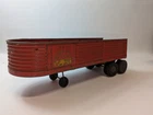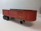 This vintage Structo red semi-trailer is a must-have for collectors and enthusiasts alike. Made of pressed steel, this 13" long trailer features tandem axles and is in excellent condition. The trailer is perfect for boys and girls over the age of 3 and was manufactured in the United States in 1960. The trailer is a great addition to any vintage toy vehicle collection and is sure to impress. The red color and pressed steel material make it a durable and eye-catching piece. This trailer is a great find for anyone looking to add to their collection or start a new one.