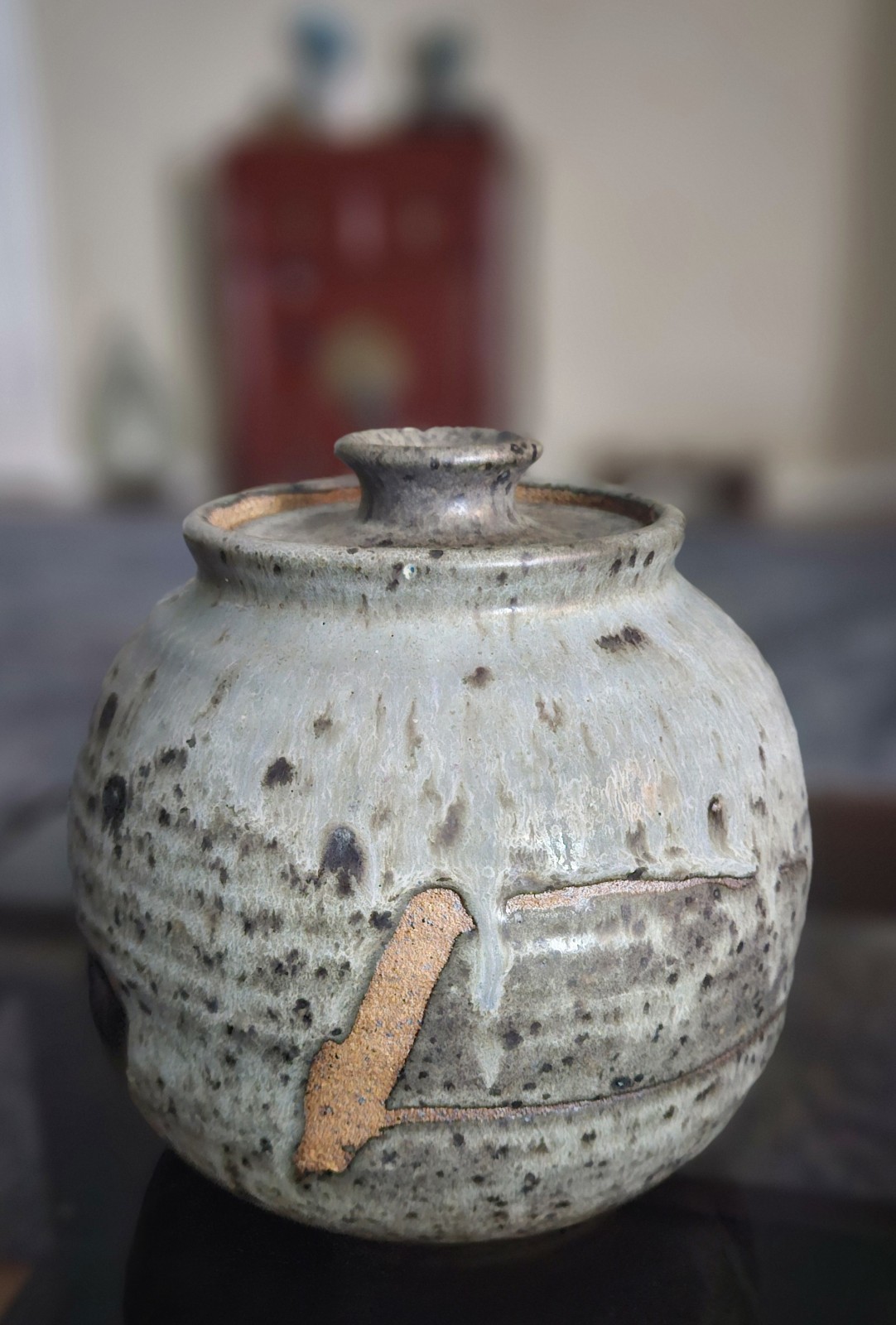Vintage studio art pottery stoneware jar with lid. 6.75"H x 6.5"W at widest point. ***Tiny chip inside of rim.*** See last photo. Otherwise in excellent condition.