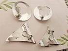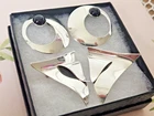 Up for your consideration is a lovely set of two pairs of Designer Susan Cummings Mid-Century Modernist earrings. One pair is pierced and the other is clip-on. The round earrings measure approx. 1 5/8” x 1 5/8” and the t op segment is accented with a dark black Onyx round stone. The Triangle earrings measures approx. 1 5/8” x 2” inches. These must be from earlier in Cummings career, perhaps from the time that she sold through Neiman Marcus, because her current website has nothing in this style. The overall condition is excellent with minor wear. This would make a great gift or a nice addition to any-ones jewelry collection. Thanks for looking! Please check out more of my auctions. *** Happy Bidding*** Before purchasing please read the description carefully, look at all the photos posted, and contact me if you have any questions. Shipping & Payment Details: Flat fee shipping cost of $6.85 to USA buyers only. “No International shipping”. Please e-mail me with any questions you may have prior to bidding.