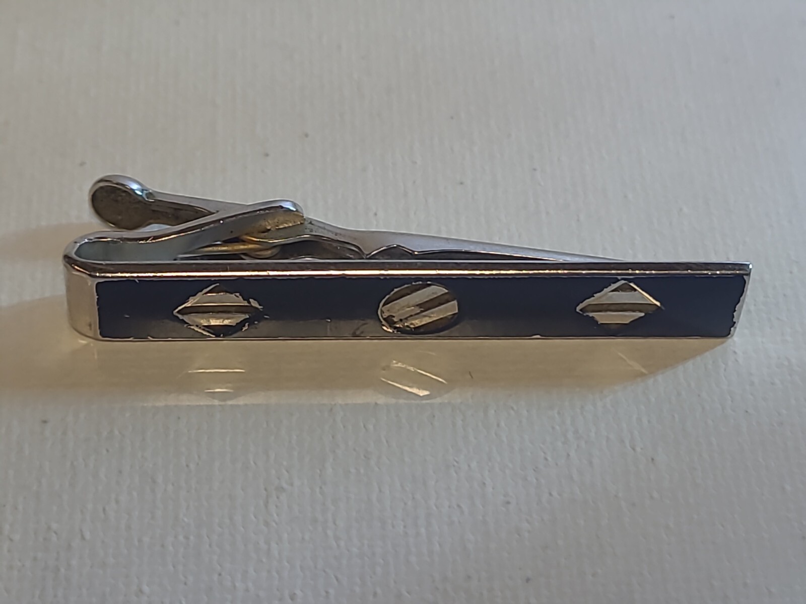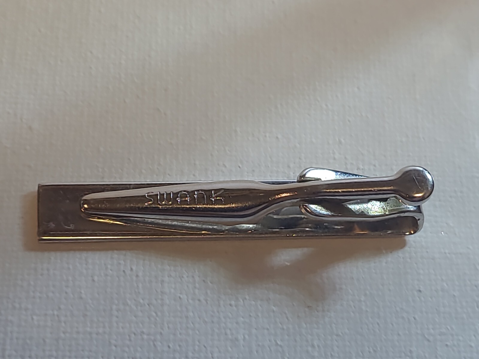 This vintage tie bar clip is a stylish and elegant accessory that adds a polished touch to any outfit. The navy blue color is rich and versatile, while the 2" size is perfect for securing ties without slipping. The Swank branding ensures quality craftsmanship, and the retro design gives it a unique, timeless appeal. A must-have for anyone who appreciates classic menswear details!