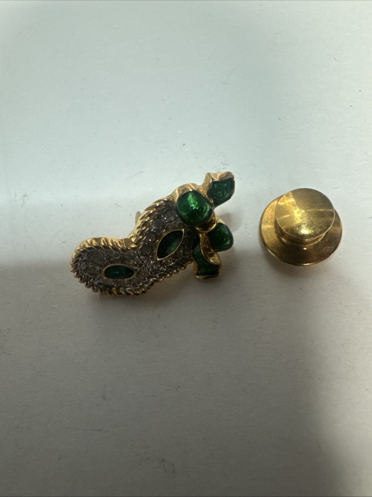 This vintage pin is a tie tac style featuring a green enamel design with a white/colorless crystal as the main stone. It is signed by Swarovski with their distinctive swan mark and is crafted in yellow gold plated metal. The pin has a Mardi Gras theme, making it a unique and eye-catching accessory for any vintage jewelry lover. Please see photos for condition. Please feel free to contact us with any questions before purchasing.