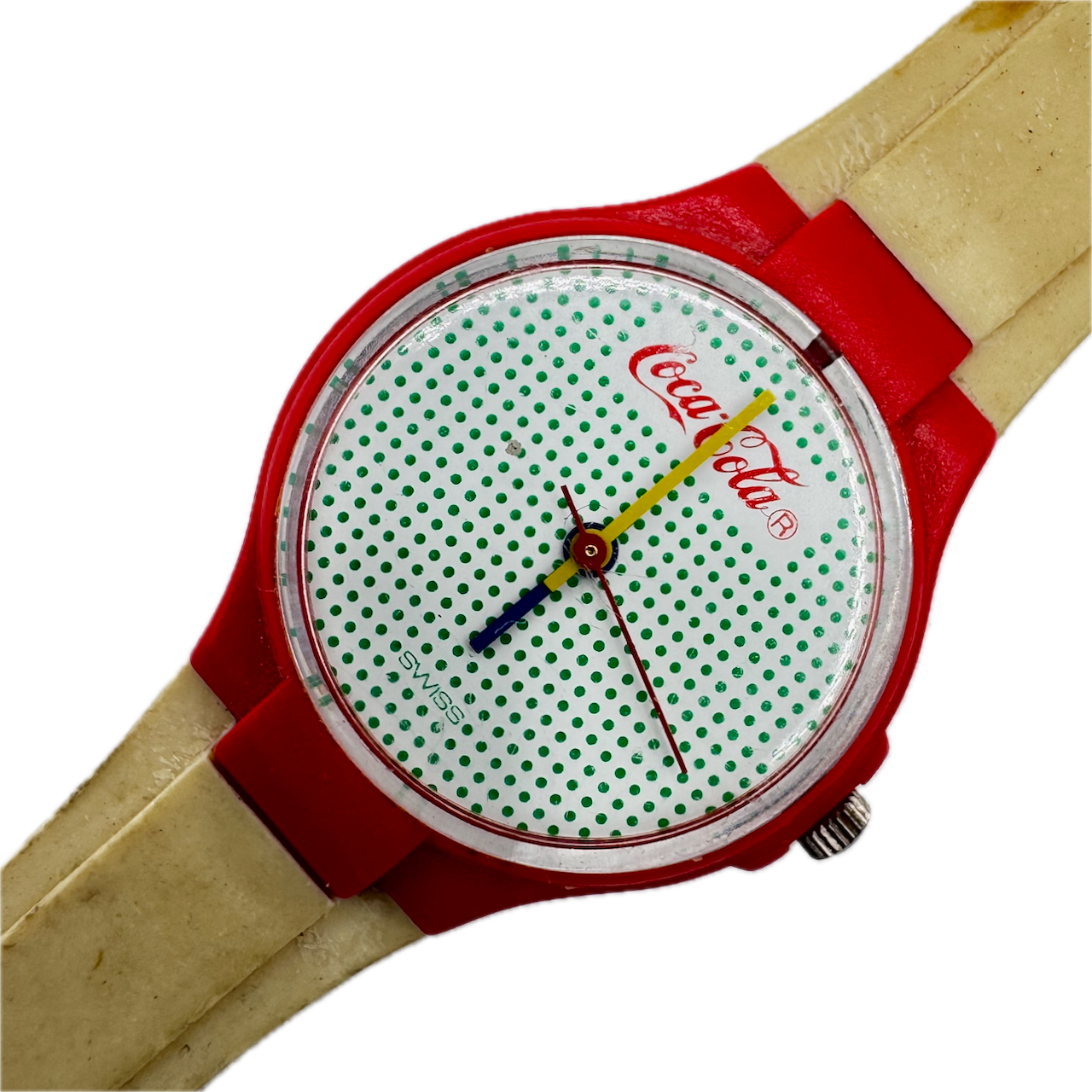 Vintage Coca-Cola Dotted Men's Quartz Wristwatch ETA 625 Swiss Plastic Product Description Item: Wristwatch Brand: Coca-Cola Model: Dotted Movement: Quartz Case Material: Plastic Country: Swiss Gender: Men's Caliber: ETA 625 Size: 26mm Product Measurements Diameter: 26mm Lug Width: 7.5mm Lug to Lug: 32.5mm Thickness: 8 mm Product Condition Overall Condition: Fair, overall condition for its age. Functions: Not running, has been tested and is not running. Case: There are scratches on the case. Crystal: There are scratches on the crystal. Dial: The dial is in good condition. Band: The band has some wear on it.