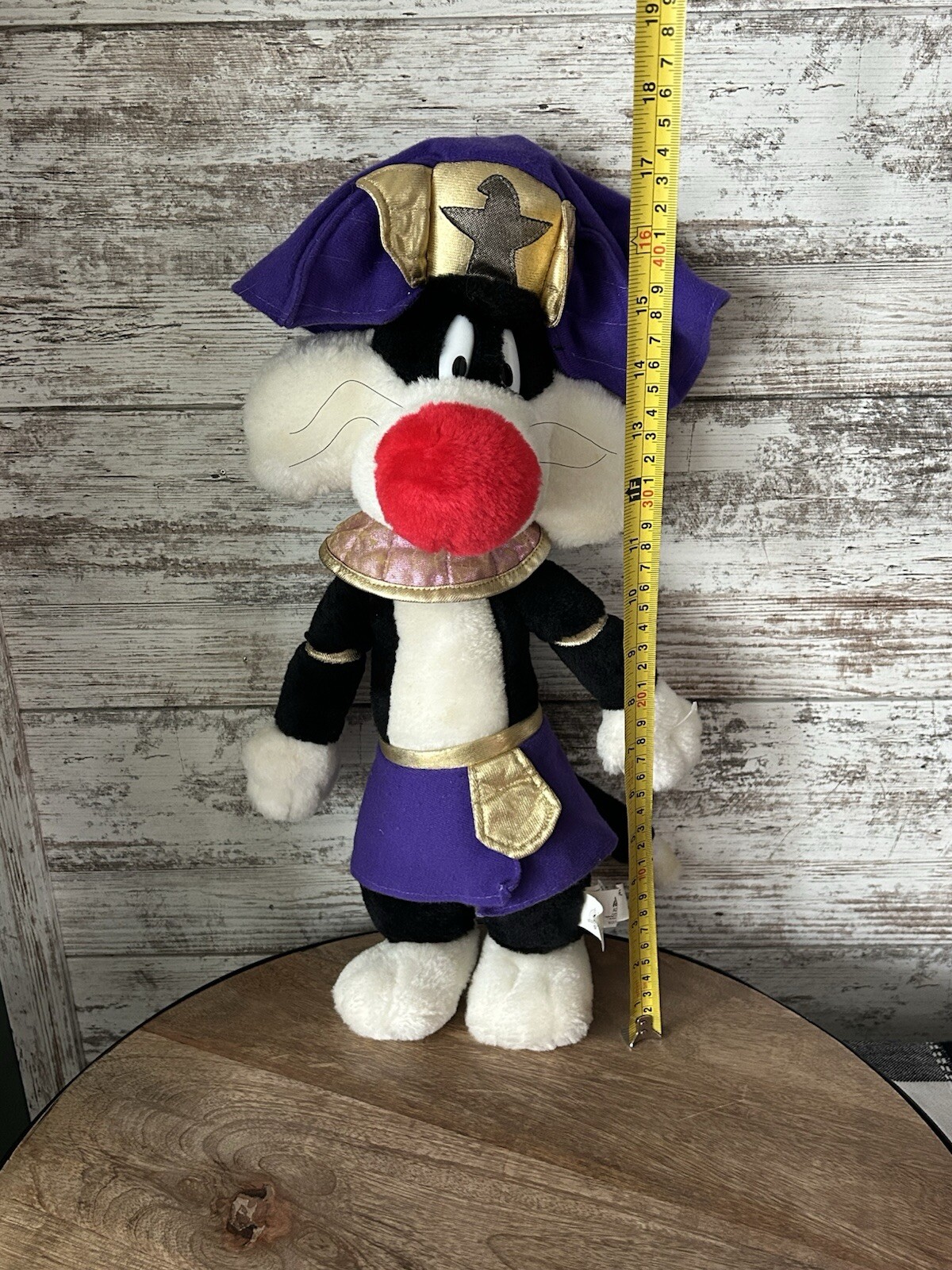 The product is a rare vintage Sylvester the Cat plush toy, measuring 17.5 inches in height. Manufactured in 1998 by Ace Play by Play Toys, this interactive plush features the beloved Warner Bros. Animation character in multicolor. Perfect for fans of Looney Tunes and animation, this vintage collectible from China is a must-have for any cartoon and TV character enthusiast.