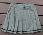 This is a listing for a pre-owned vintage Tail tennis skirt in a size 8 (modern small). It is made in the USA and has a green grosgrain ribbon trim and elastic side panels at waist. It has a back zipper closure and cute enamel green button with gold trim. Please ask all questions prior to auction end for all sales are final. Thank you & good luck! BRAND: TAIL SIZE: Vintage US size 8. 13.5" across waist lying flat, 15.5" in length Fabric: 100% polyester Unlined Made in USA