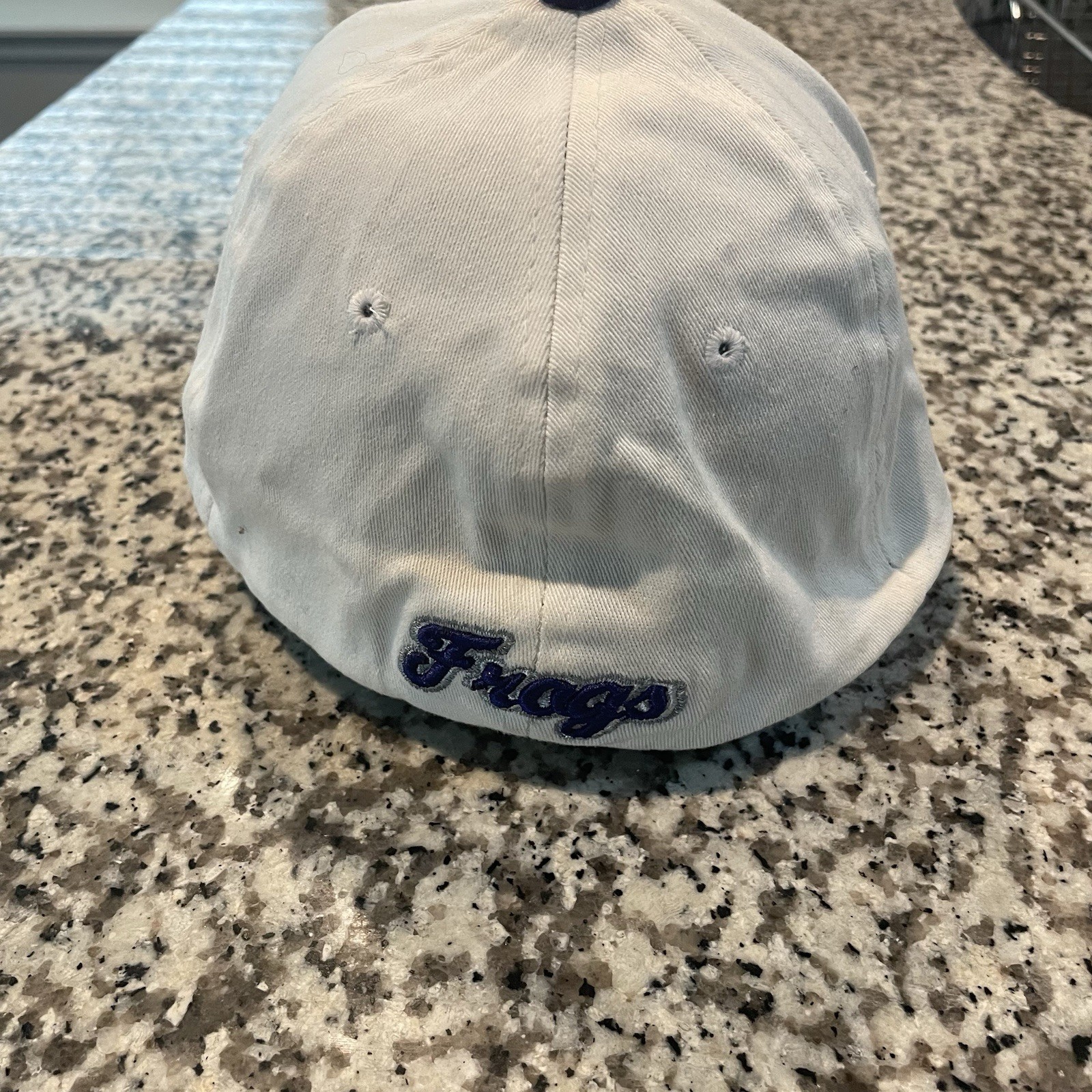 This vintage Texas Christian Baseball Embroidered Cap by Zephyr is a stylish and comfortable baseball cap designed for casual occasions. Made from a cotton/spandex blend, this cap features a solid design with a purple rim and intricate embroidery of horned frogs. The M/L size makes it suitable for most men, and the sports theme adds a fun and unique touch to the overall design. Whether it's winter, summer, fall, or spring, this cap is perfect for adding a pop of color and personality to any outfit. It is clean!