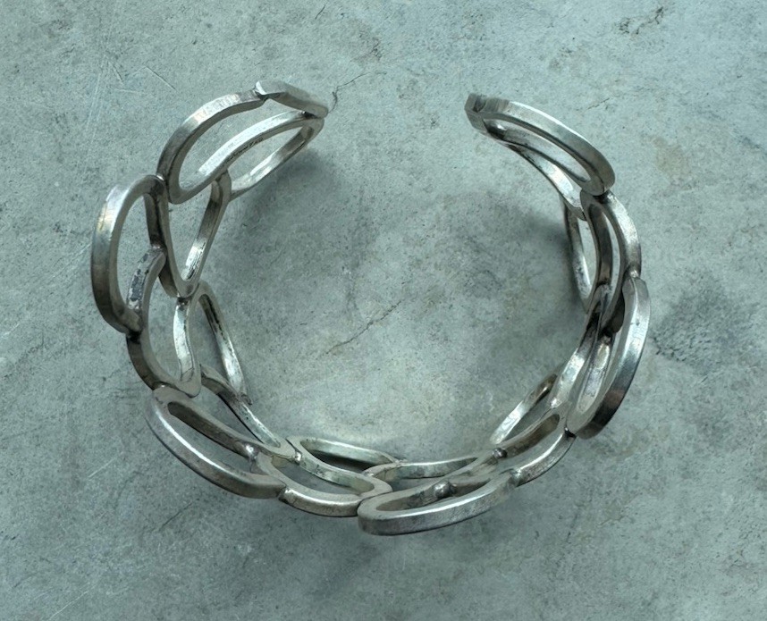 Vintage Taxco 925 Sterling Silver Abstract Art Cuff Bracelet — Signed & Handmade in Mexico, Wide 7-inch Statement Piece — Discover a timeless work of wearable art with this vintage Taxco sterling silver cuff . Handcrafted in Mexico and bearing the maker’s signature, it combines abstract artistry with bold design: Made of solid 925 sterling silver , nickel-free and safe for everyday wear A statement wide cuff (7 in) with sculptural, abstract patterns Signed by the artisan—authentic and collectible Excellent pre-owned condition with a patina that adds vintage charm From Taxco, a city renowned for exceptional silver craftsmanship Perfect For: Collectors of artisan jewelry, lovers of mid-century modern design, or style-savvy buyers seeking a standout statement cuff. #VintageTaxco #SterlingSilverCuff #AbstractArtJewelry #WideSilverBracelet #SignedTaxco #HandmadeMexico #StatementCuff #FineJewelry925 #CollectibleBracelet #TaxcoSilver