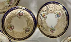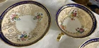 This is a Cauldon Tiffany China Pattern T-1612 gilt, cobalt, and floral teacup and saucer set. There are 10 sets. The pattern, which does not have a specific name, is a copy of a Cauldon design from 1810. It features a narrow gilt and cobalt outer laurel leaf border with a broad beige ground inner border, decorated with gilt and white oak leaves and flower heads. The cup measures approximately 4 inches across the top by 2 inches tall, and the saucer is approximately 6 inches in diameter. These were previously owned and are in excellent condition. There may be very minor signs of wear consistent with age and use. There are no chips, cracks, scratches or fading, as far as I can see. I’m not an expert so please look at the photos carefully before you purchase. But these beautiful pieces appear to be in excellent shape. Props used in the main photo are not included with these items. No international shipping.