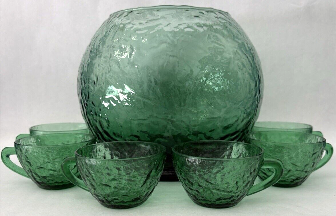 PLEASE USE THE “ZOOM” & “ENLARGE” FEATURE. Photos are of the actual item listed. No chips, cracks, crazing, fleabites, repairs, paint loss or dishwasher damage. Teal Green MCM Crinkle Glass Punch bowl with 6 matching Cups Punch bowl has a flat bottom base measuring 6 1/2" Measures 8" tall x 6" opening at the top rim 6 matching cups Cups hold 4 fl oz. and is 4" wide including the handle Cups are molded or pressed glass Sticker on the bottom of the punch bowl - Made in Italy All items that I sell are used, vintage or just plain old and may show some form of wear, scratches, dents or imperfections which make them unique. I will note any and all imperfections that I am aware of. Please keep this in mind when purchasing. They are from an unknown environment. My In-laws were antique dealers for 35+ years and did estate sales and these items are from either their or my personal collection. I try to do thorough research gathering information from internet searches and respected dealers in the business to confirm that what I am listing is authentic and valued appropriately. I am no expert. Just sharing what I have found with those interested. They may need a good cleaning or polishing. I try hard to give an accurate description of my listings and I make every effort to list any imperfections in the description and with the pictures showing details. Please look a the pictures carefully. If you need any additional information or have a question, simply shoot me an email. I will do my best to quickly answer them to your satisfaction. Packing is of utmost importance to me and I am careful to be sure the items are well protected. I use recycled packing boxes and material from non hazardous materials. If you have a problem with this, please contact me. Should you receive a package with obvious damage, please take a photo for proof of damage prior to opening and the damage of the item. I will need these to process a claim to get our money back. OFFERS: I accept most reasonable offers. I also offer combined shipping. I ship items within 24 hours from the time payment is made. I will ship only to the address on record. Customer service is very important to me, so if there is a problem with your purchase, please contact me, I will do everything I possibly can to resolve the issue. I strive to have satisfied and repeat customers. Please remember to leave positive feedback. I will gladly do the same. I generally wait until delivery confirmation is received to leave feedback. At the end of the day purchase what gives you joy. It’s not about matching styles of the moment or replicating someone else’s style. Take your time and have fun with the search. Thank you for looking and happy Ebaying! I truly appreciate your business! Please save me as a seller and share my listings with your friends. VINTAGE CONDITION RATING SCALE Excellent: A well cared for vintage item that appears to have seen limited use and is still in above average great condition for being vintage. It may hardly show any signs of wear. Great: A well cared for vintage item that is in very good condition for being vintage with only minor signs of wear. Good: A vintage item that shows normal wear from consistent use but still remains in good condition. Acceptable (Fair): The vintage shows more that normal wear, but can still be used for its intended purpose. Inv 18924