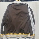 Small areas of discoloration and missing zipper This vintage men's jacket from The North Face features a multicolor design with a brown color base and a full zip closure. The jacket is a size Large with a regular fit, suitable for everyday wear. Made of a blend of polyester and cotton, this windbreaker style jacket is a classic piece with a solid pattern. Perfect for outdoor activities or casual outings, this jacket combines style and functionality in a retro design.