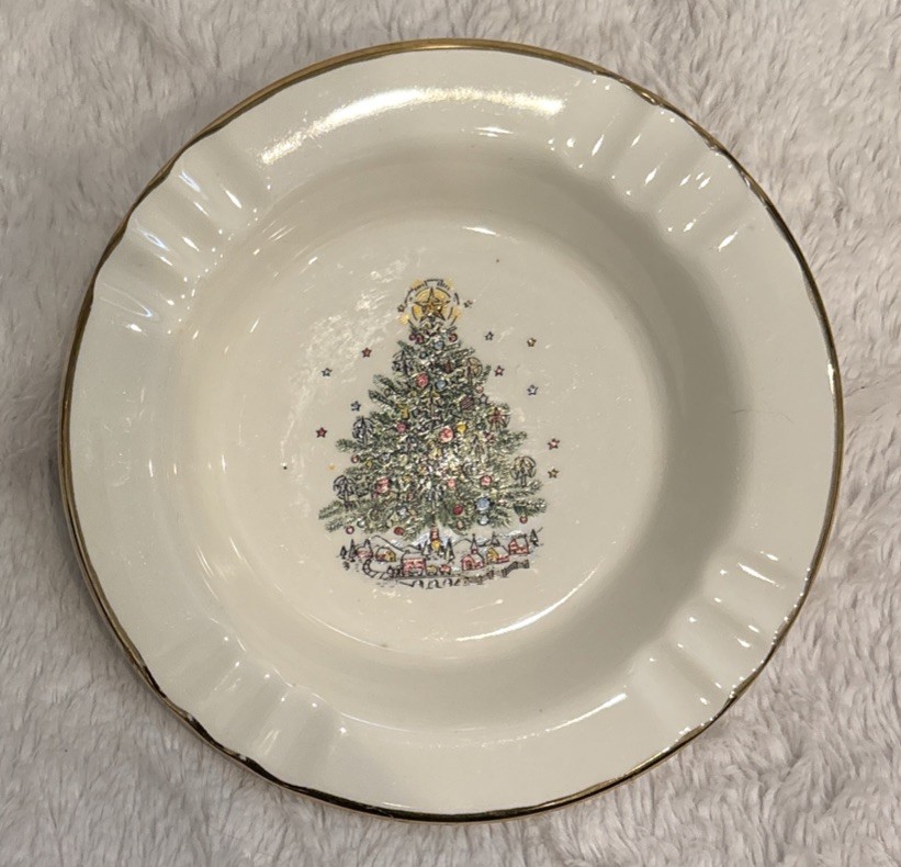 The Vintage The Sabina Line White Porcelain Christmas Tree Ashtray with 22k Gold Trim is a collectible piece that adds a touch of elegance to any space. Made in the United States, this ashtray features a festive Christmas tree design and luxurious gold trim, making it a unique and eye-catching addition to any collection. Perfect for adding a touch of vintage charm to a tobacco or cigar enthusiast's collection, this ashtray is both functional and decorative.