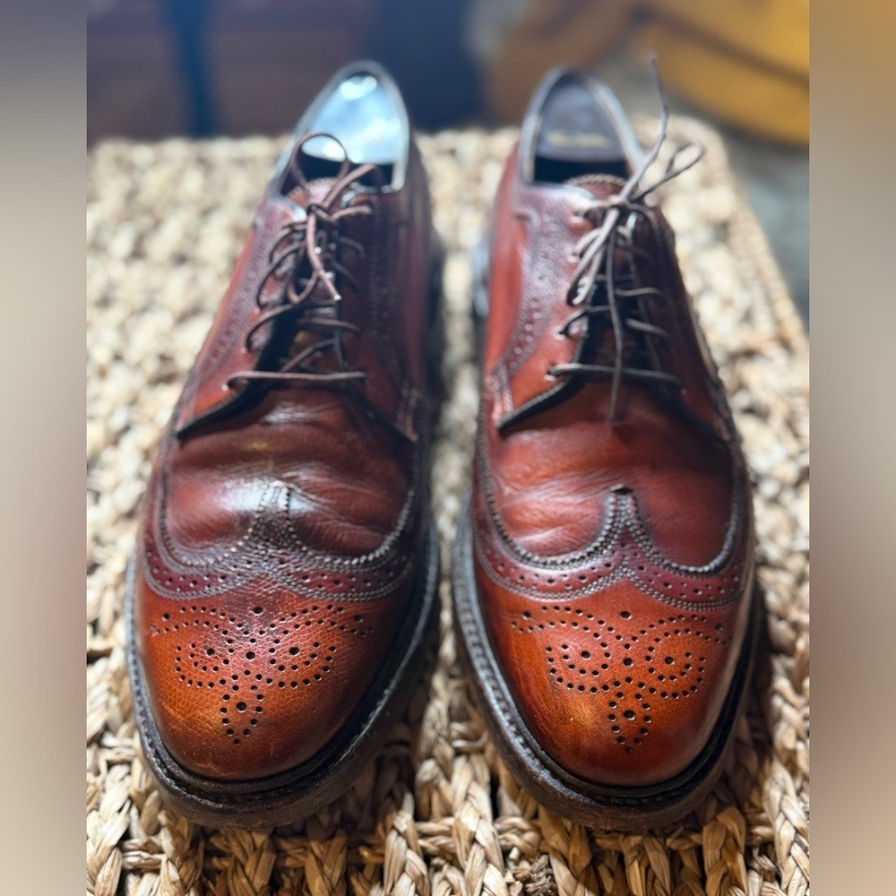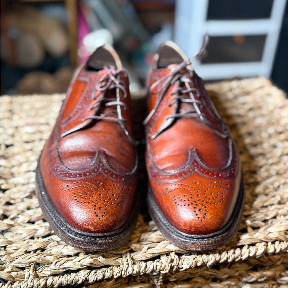 Beautiful vintage Thom McAn full brogue oxfords crafted in rich brown leather with classic wingtip and perforated detailing. These heritage-quality shoes feature genuine leather uppers, leather lining, and traditional leather outsoles with rubber heel caps. The patina shows natural aging and character while maintaining structural integrity—an excellent pair for anyone who appreciates classic menswear craftsmanship. A versatile style that pairs effortlessly with denim, chinos, or tailored trousers for a timeless smart-casual look. Size: Men's 8.5 Model Numbers Inside: 4100 / S67129 Color: Brown Material: Genuine leather upper, leather lining, leather outsole Condition: Good vintage condition. Light creasing and wear consistent with age. Soles show normal wear with plenty of life remaining. No major flaws. Style Details: • Full brogue wingtip Oxford • Genuine leather construction • Lace-up closure • Stacked heel with rubber cap • Classic heritage menswear profile 5-Star Rated Seller | Fast Shipping quiet luxury, heritage menswear, classic oxford, timeless style, vintage leather, old money aesthetic, smart casual Model image was created with AI.