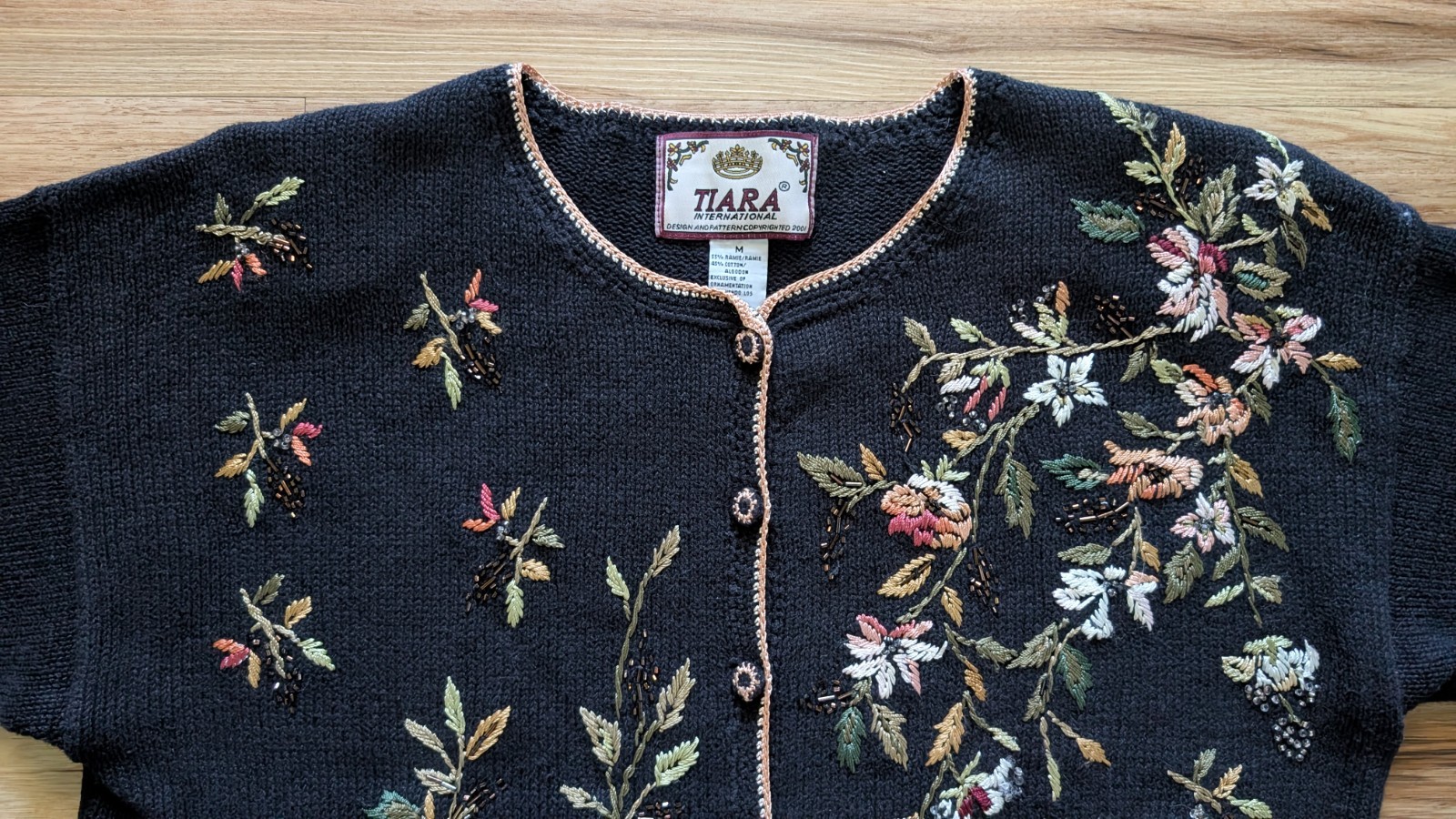 Tag size medium. Laid flat, the chest measures approx 20 inches and the length is about 23 inches. Minor pilling and some loose threads as pictured. Nice condition!